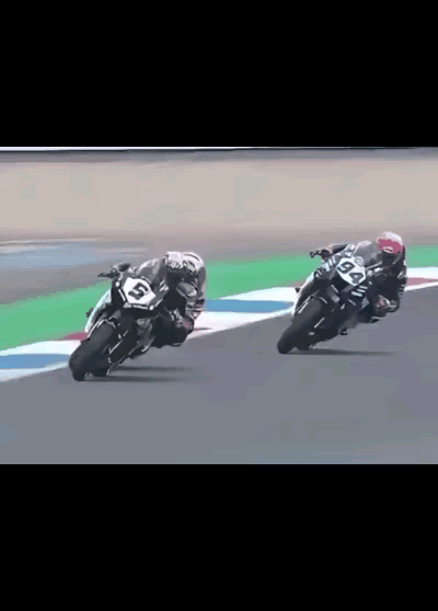 张雪机车在比赛中遭恶意干扰,5号杜卡迪赛车手试图用脚踢53号张雪机车的摩托车头,好在被张雪机车刹车躲过!