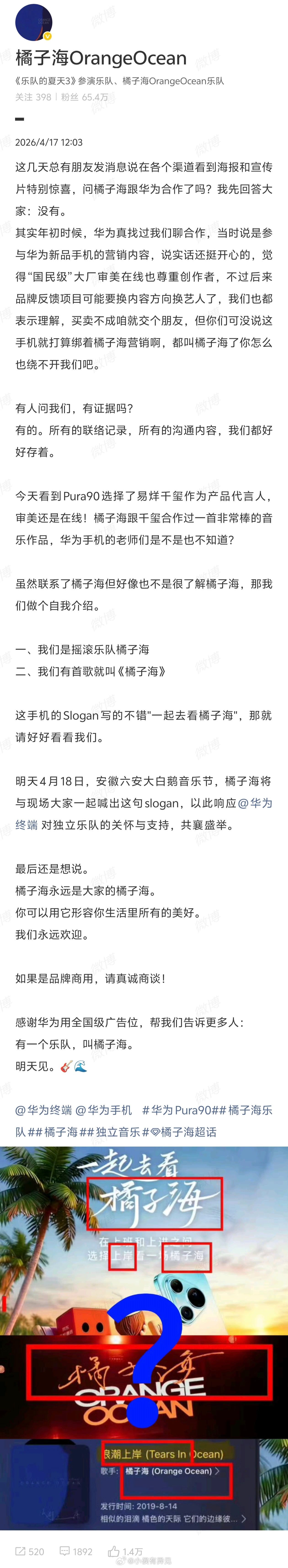 余承东称橘子海颜色源于自然前脚刚闹得沸沸扬扬,后脚发布会上轻飘飘一句,没提乐队、