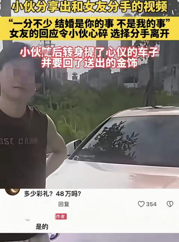 谈崩了!男子和女友谈结婚彩礼,女友张口要48.8万彩礼,男子惊呆,女友却说:一分不能少。男子说:借钱,也是我们一起还啊?女友果断拒绝:我肯定不还,结婚是你的事,不是我的事。之后,女友的话句句扎心,男子心碎提出分手,转身买了一辆心爱的车,还做了一个让人解气的决定。