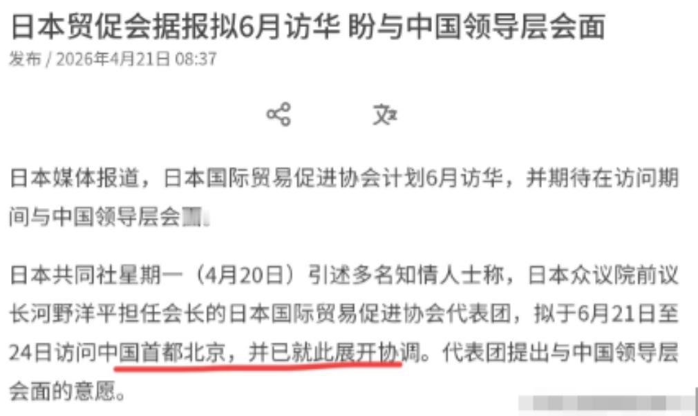 4 月 21 日,日本共同社援引业内知情人士消息披露,由日本前众议院议长河野洋平牵头带队、日本国际贸易促进协会组建的访华代表团,计划敲定 6 月 21 日至 24 日赴北京展开访问,目前双方正在加紧对接协调。
