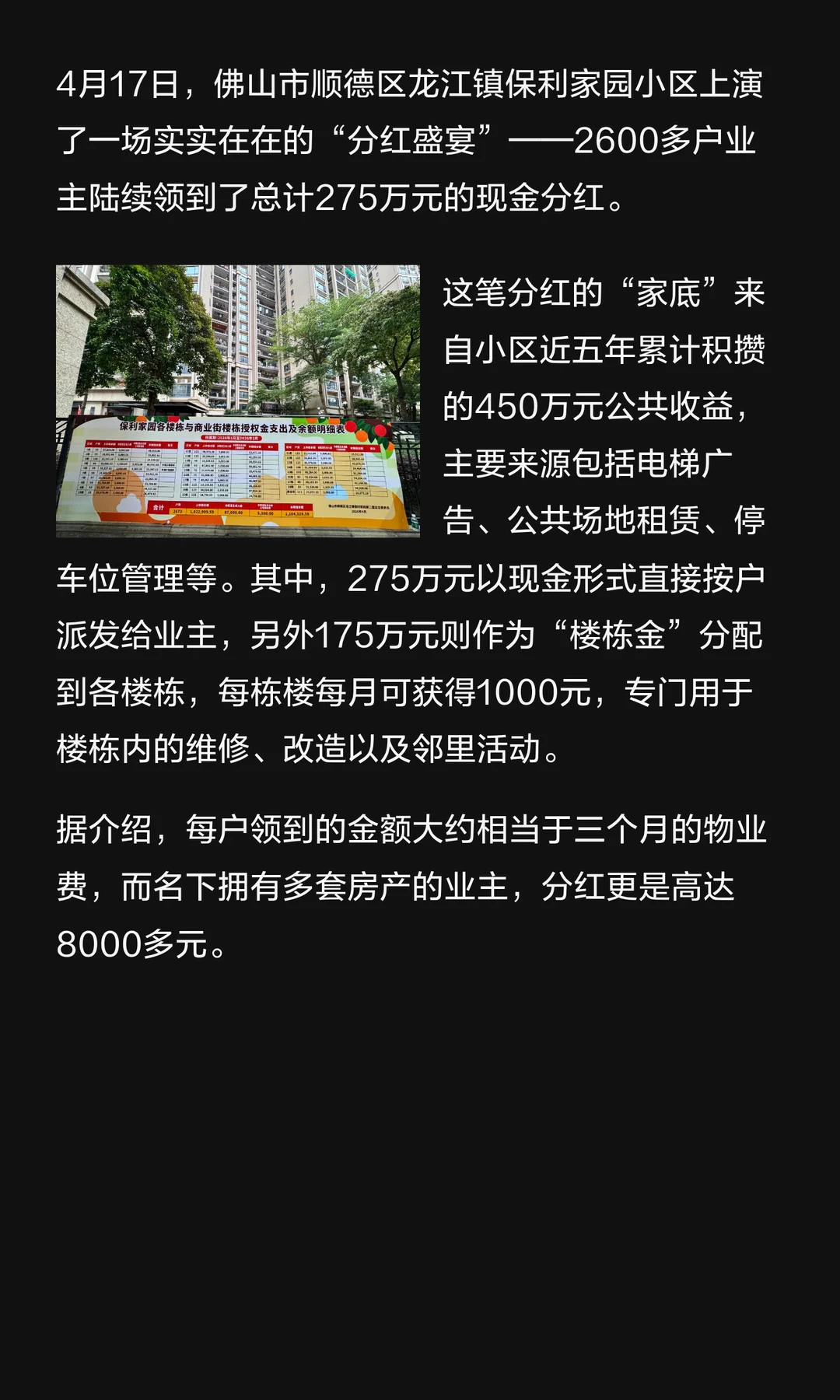 必须实名羡慕!佛山一小区分红450万!