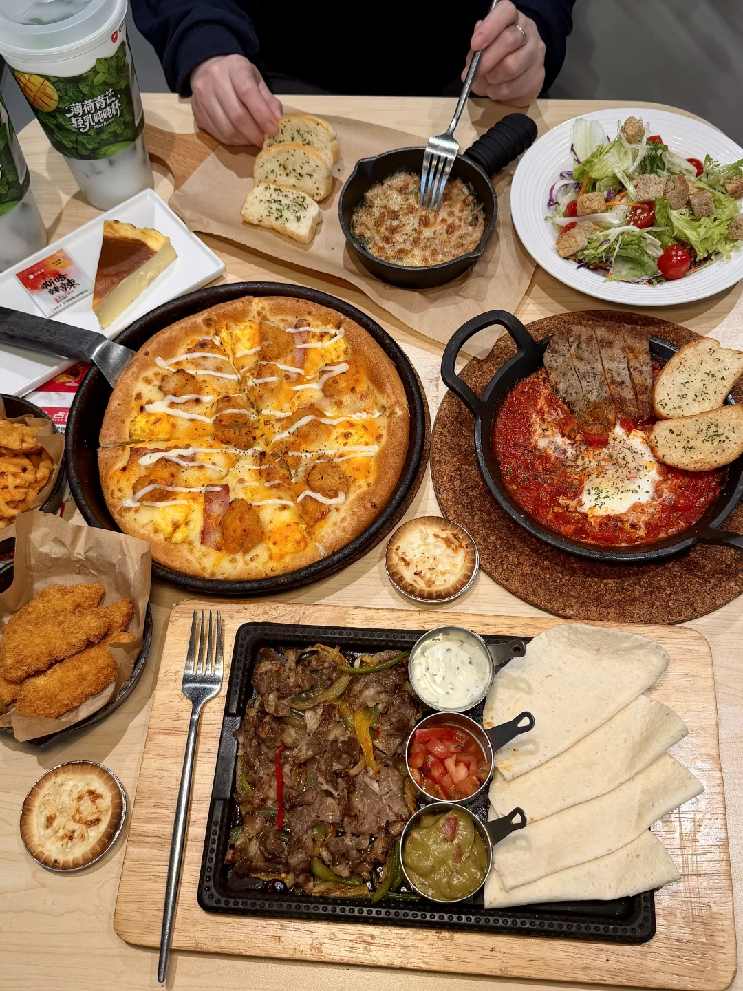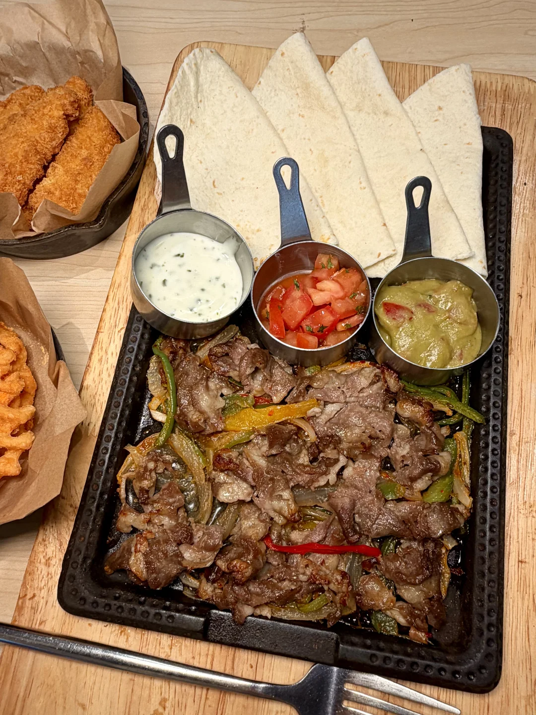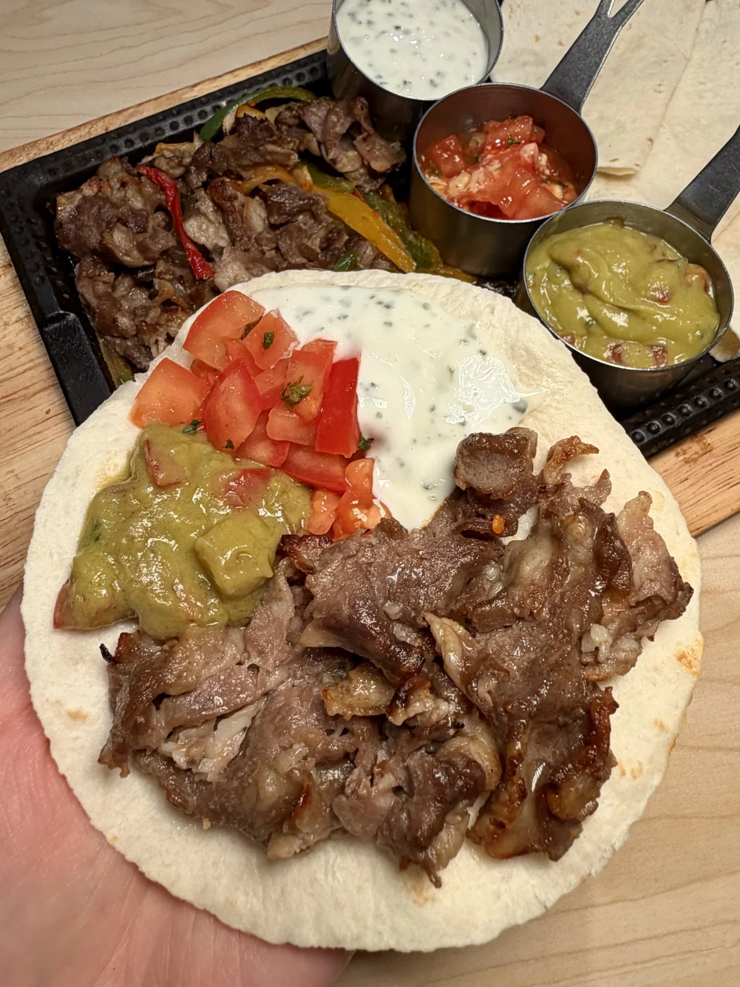 在铁板上滋滋滋的肥牛闻着就一整个香晕了!吃法就像北京烤鸭一样,搭配牛油果酱🥑、莎莎酱、薄荷酸奶酱…用薄饼裹起来,一口焦香~直接吃出墨西哥风味!