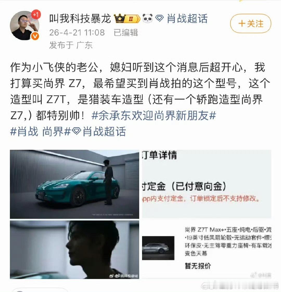 肖战空降就是最高title果然优秀的人才能吸引优质粉丝接受过央视新闻小尼的采访的这位虾姐夫说,因为妻子是肖战粉丝小飞侠,在线实力宠妻订了一台Z7 肖战 尚界 肖战空降就是最高title