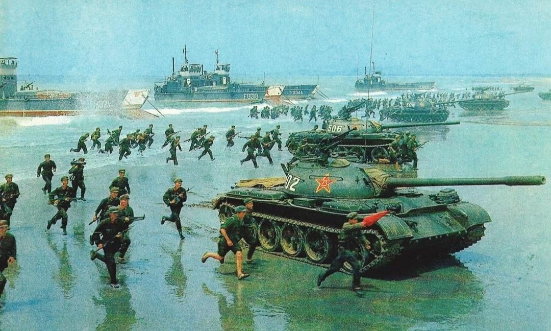 上世纪七十年代的老照片,记录了当年解放军福州军区在东南沿海组织渡海登陆演习的情形:身着65式军服的解放军登陆部队从登陆艇上涉水登陆,在62式坦克的掩护下向滩头阵地发起冲锋!