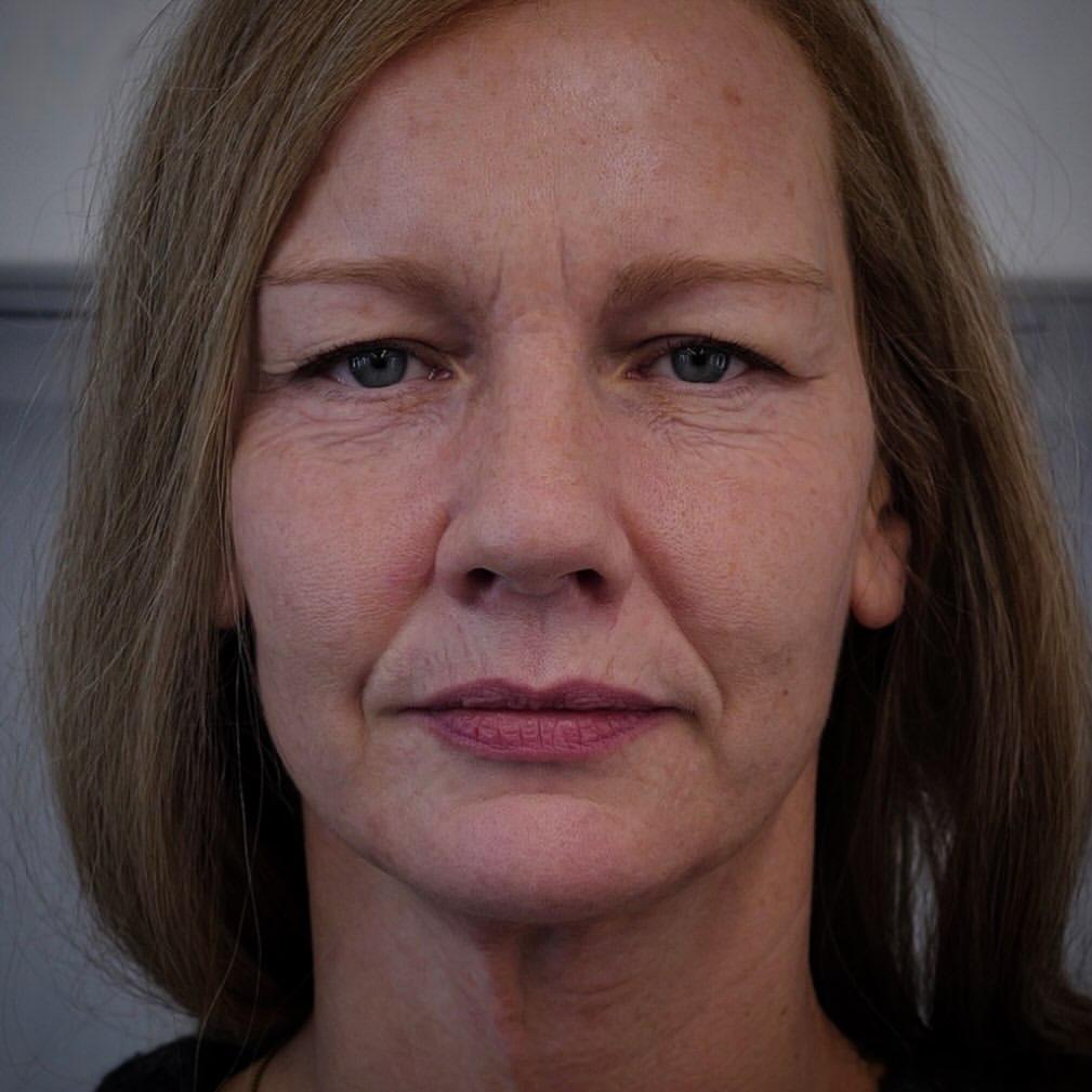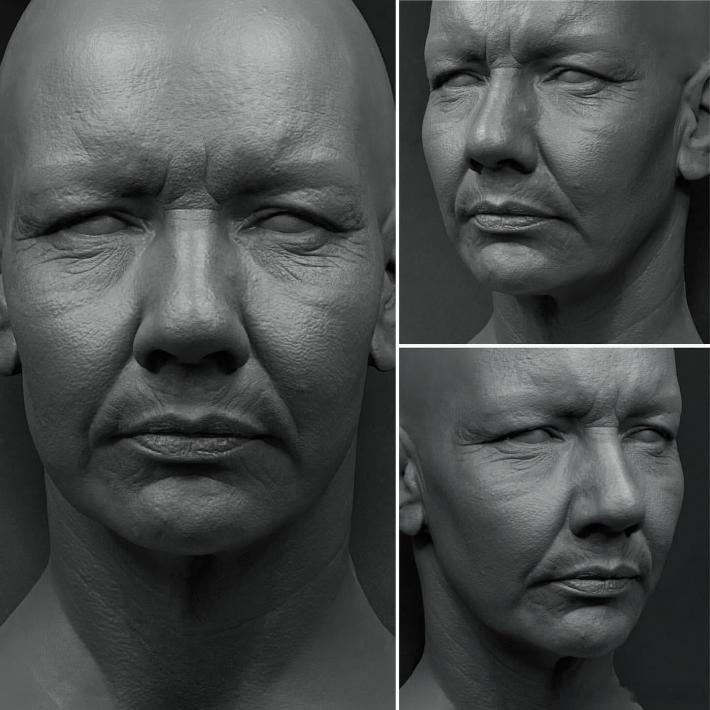 这个妆容由 10 个特效假皮部件组成,包括:鼻梁、鱼尾纹、眼袋、上下嘴唇的贴片,以及一个细微的颈部下垂皱纹部件。