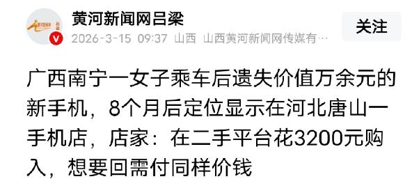 广西南宁,女子坐出租车将1万多的新手机遗失,司机却说没看见,女子通过定位发现手机在南宁,之后,定位中断,8个月后,女子发现手机定位在河北唐山一家手机店,女子想要回手机,店家却说:我花3200元在二手平台买的,你想要回,得支付我3200元。女子只好报警,可结果让她很无奈。