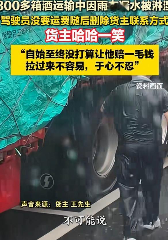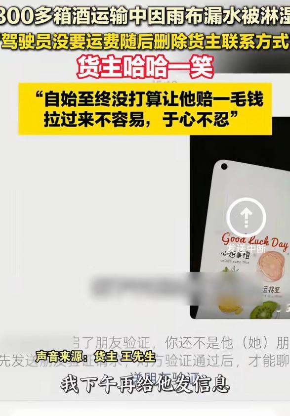 “老板大气!”安徽,男子找一货车司机运送345箱酒,送到后,他掀开雨布发现最少有300箱酒被淋湿,司机说:340元运费我不要了,你看咋弄吧。然后,开车走了。等男子给司机发信息协商时,不料,对方竟然把拉黑,微信也删除了。男子无奈,哈哈一笑说:我从来没打算让他赔一毛钱。之后,说了一番话令人感动。网友:司机格局小了。