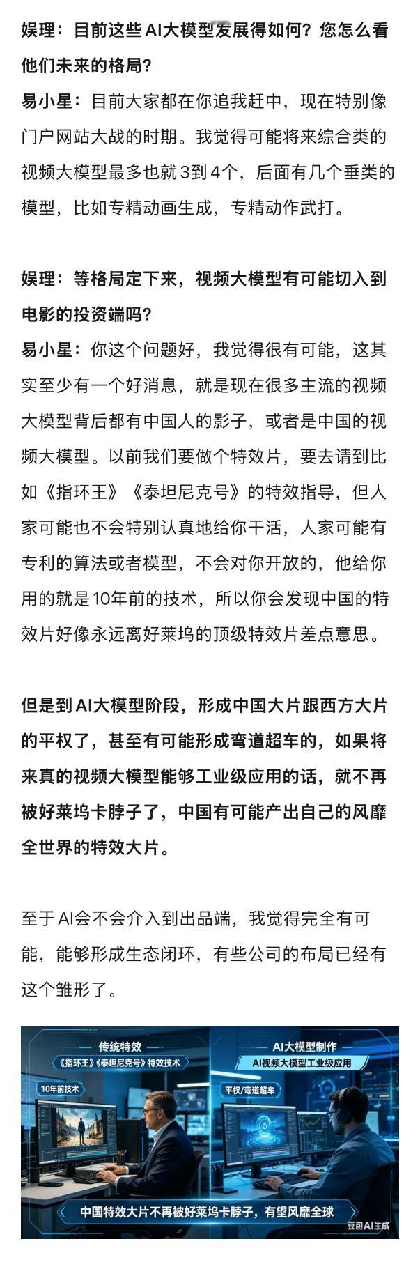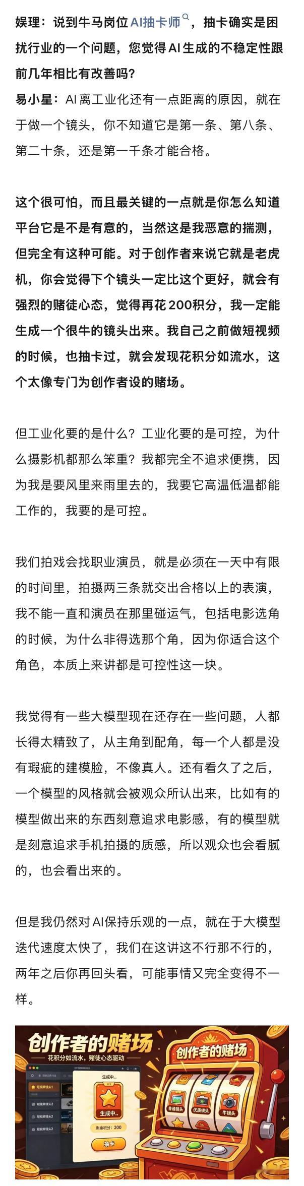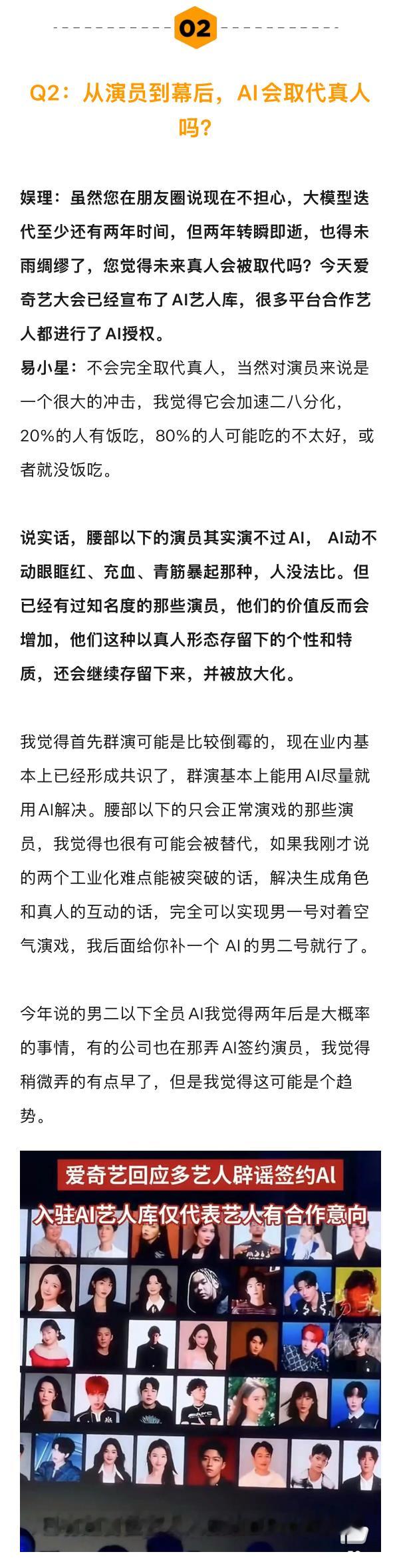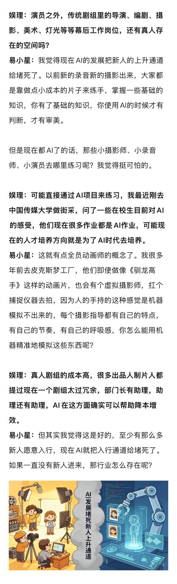 易小星说腰部以下演员演不过AI易小星说AI堵死了新人的上升通道 和新浪娱乐工作室独家对话时,导演易小星分享观点,直言AI生成的演员都太精致了,是没有瑕疵的建模人,他认为AI不会完全取代真人,但会加速二八分化,“说实话,腰部以下的演员其实演不过AI, AI动不动眼眶红、充血、青筋暴起那种,人没法比…今年说的男二以下全员AI我觉得两年后是大概率的事情,有的公司也在那弄AI签约演员,我觉得稍微弄的有点早了,但是我觉得这可能是个趋势。”娱理独家