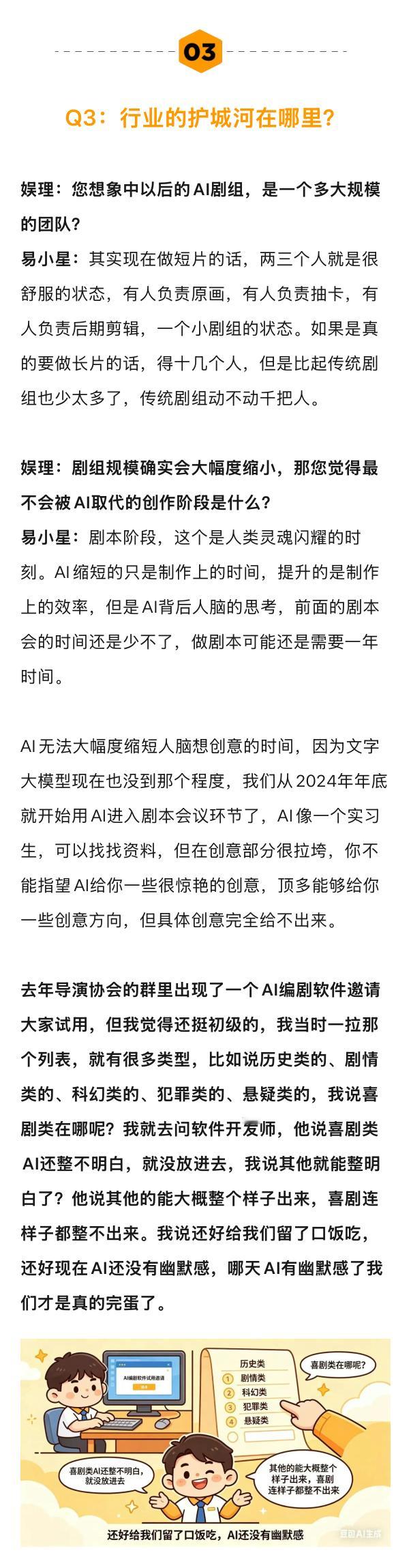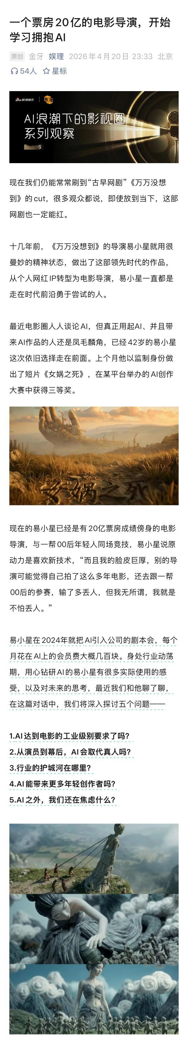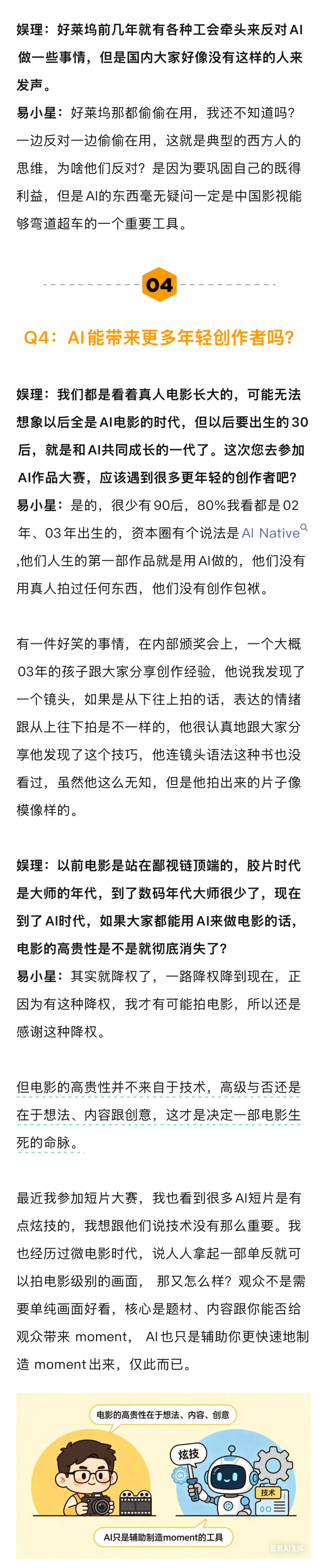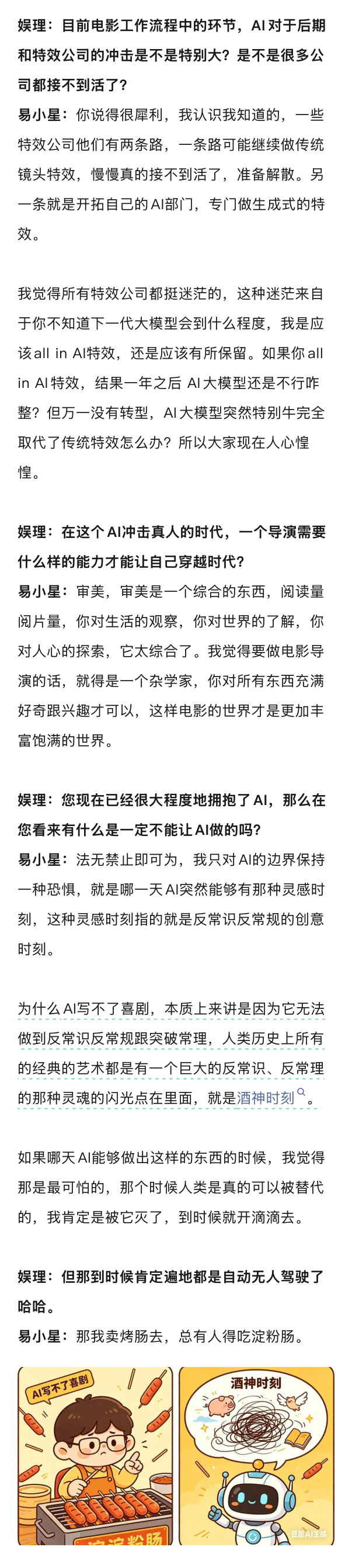 易小星说腰部以下演员演不过AI易小星说AI堵死了新人的上升通道 和新浪娱乐工作室独家对话时,导演易小星分享观点,直言AI生成的演员都太精致了,是没有瑕疵的建模人,他认为AI不会完全取代真人,但会加速二八分化,“说实话,腰部以下的演员其实演不过AI, AI动不动眼眶红、充血、青筋暴起那种,人没法比…今年说的男二以下全员AI我觉得两年后是大概率的事情,有的公司也在那弄AI签约演员,我觉得稍微弄的有点早了,但是我觉得这可能是个趋势。”娱理独家