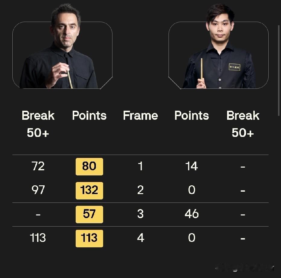 首局奥沙利文就单杆打出72分,顺利拿下。第二局更是单杆轰出97分,以132:0再赢一局。第三局双方打得非常胶着,贺国强也看到了拿下来的希望,但最终还是46:57输掉。第四局火箭再接再厉,单局轰出113分后再次零封贺国强,半场4:0领先。本场比赛有可能会打破吴宜泽刚刚创造,今年世锦赛中10:2获胜的最大分差。