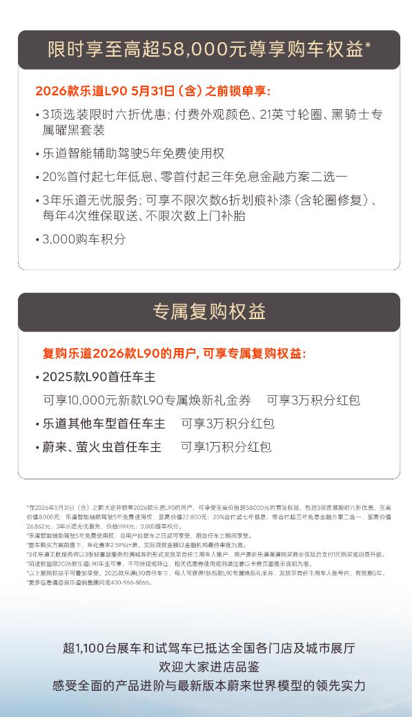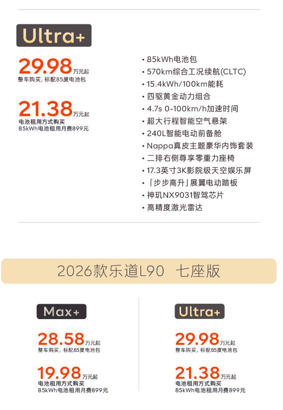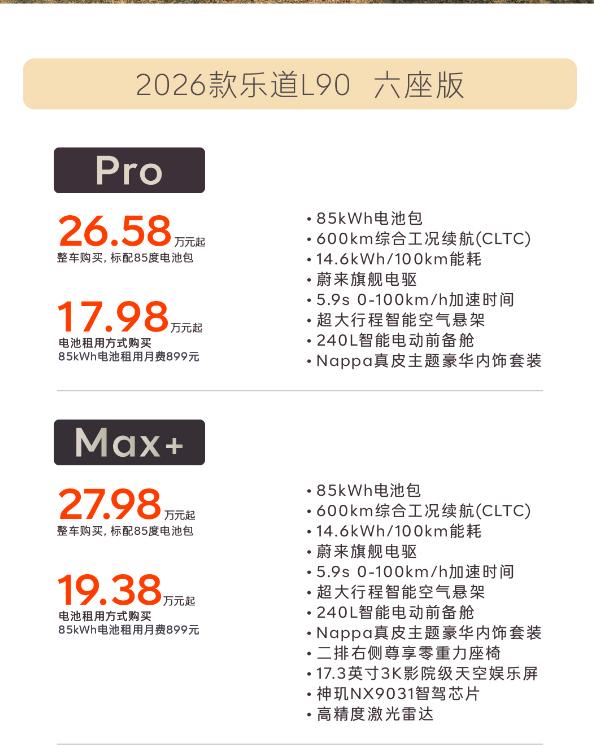 2026款乐道L90焕新登场,官方指导价26.58万起,BaaS电池租用立减8.6万,17.98万就能拿下,八大板块超70项软硬件升级,5月9日全国正式交付。