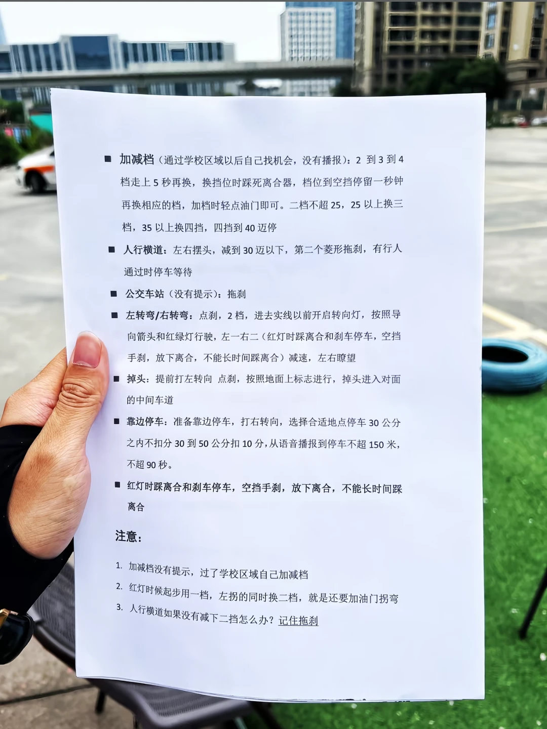 • 直行路口:左右摆头,第二个离合菱形拖刹,黑线拖刹速度22迈左右,不超30迈,按照红绿灯行驶。