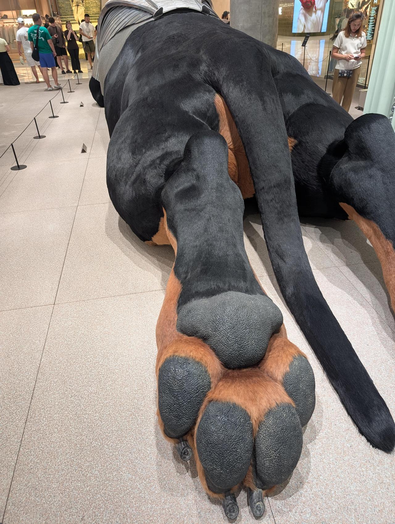 这是泰国曼谷IconSiam商场Tamburins店铺门口的一只巨型小狗雕塑,位于Charoen Nakhon路299号。雕塑的耳朵会动,吸引了许多游客围观拍照。有人开玩笑说它像现实版《大红狗克里弗》,也有人好奇它是不是蛋糕做的。这只巨型小狗成了当地一个热门打卡点,让商场的人气更旺了。