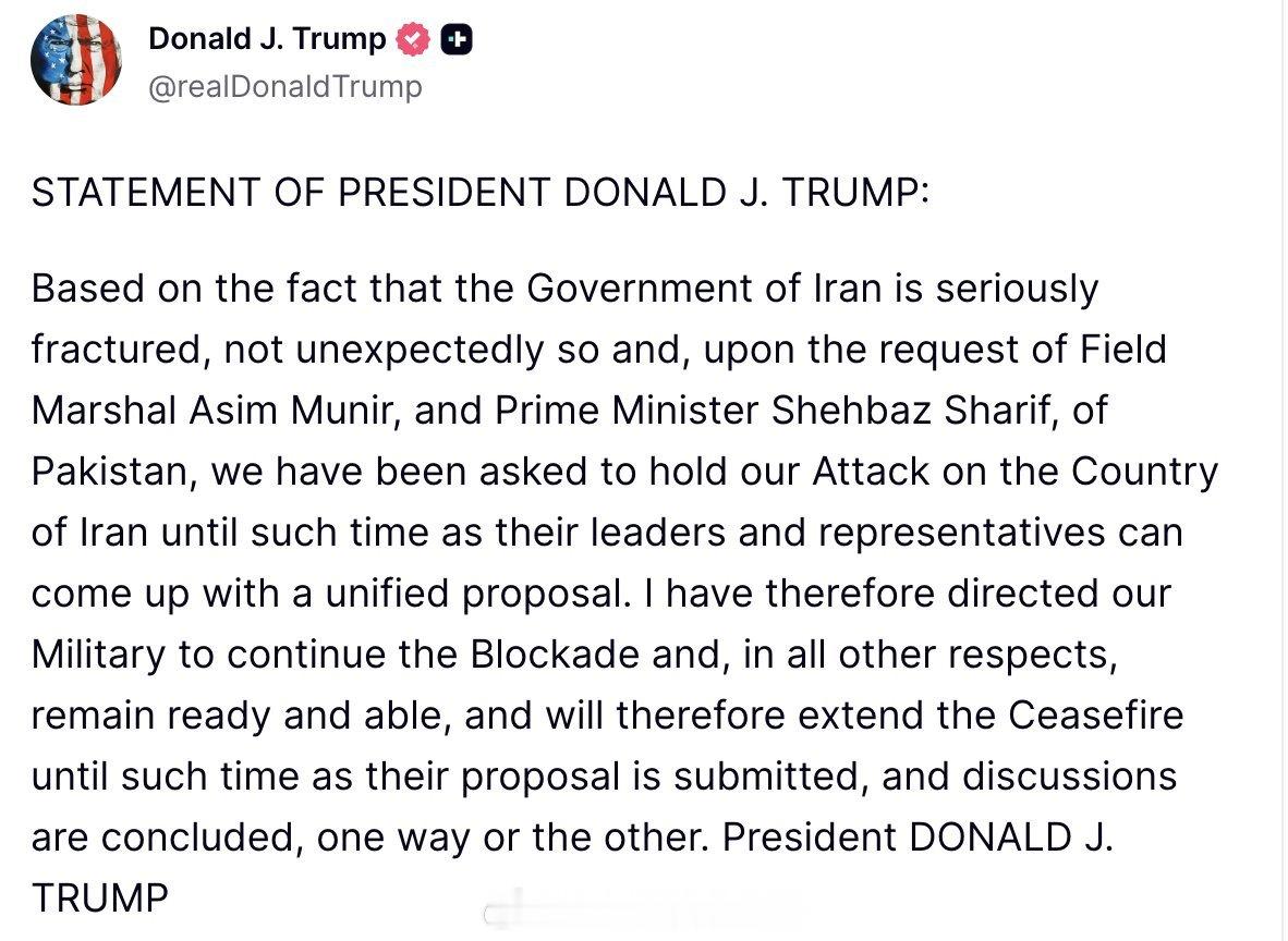 鉴于伊朗政府严重分裂(这一点并不令人意外),并且应巴基斯坦陆军元帅阿西姆·穆尼尔和总理谢赫巴兹·谢里夫的请求,我们被要求暂缓对伊朗的攻击,直到其领导人和代表能够提出一个统一的方案。