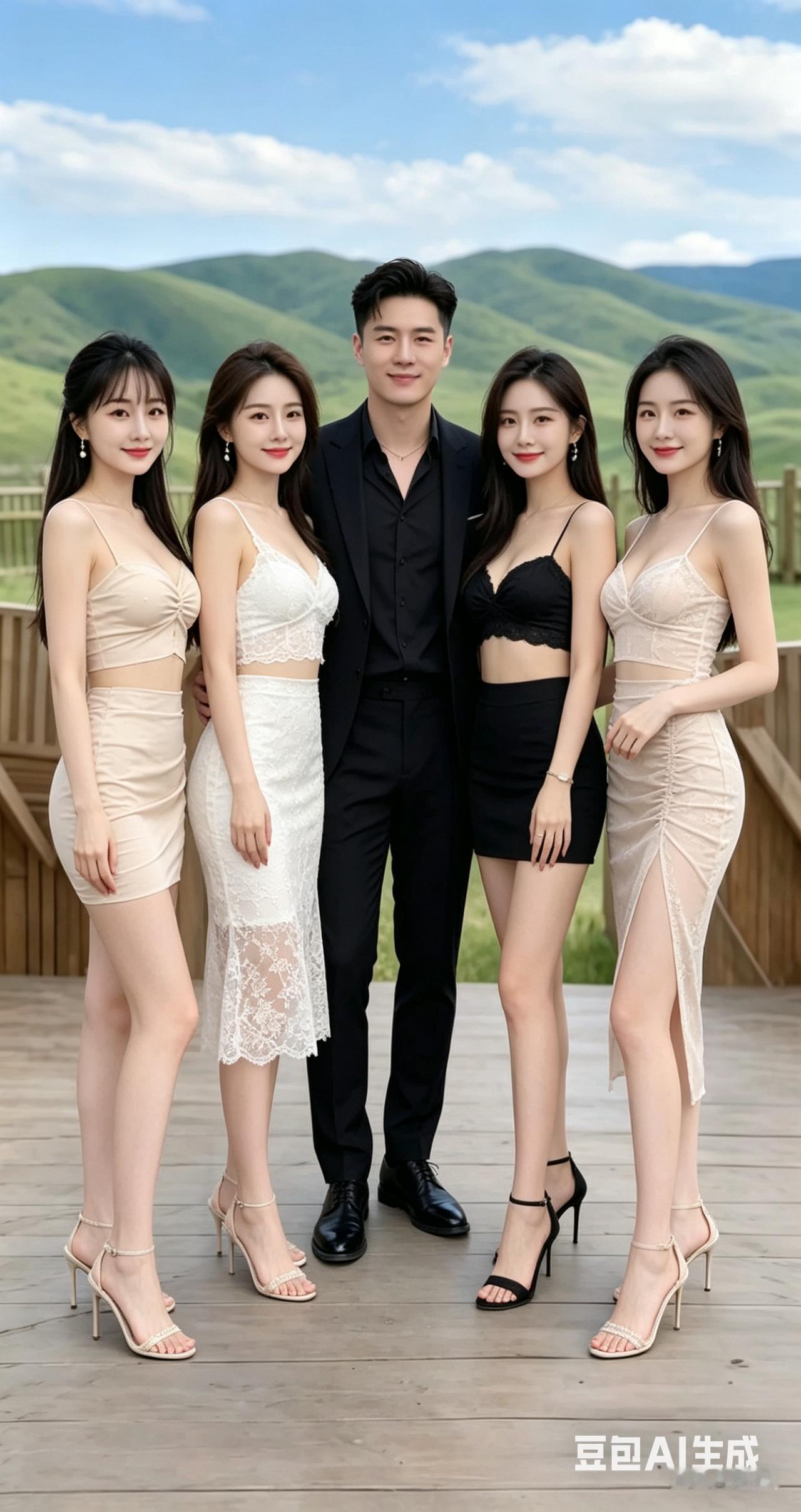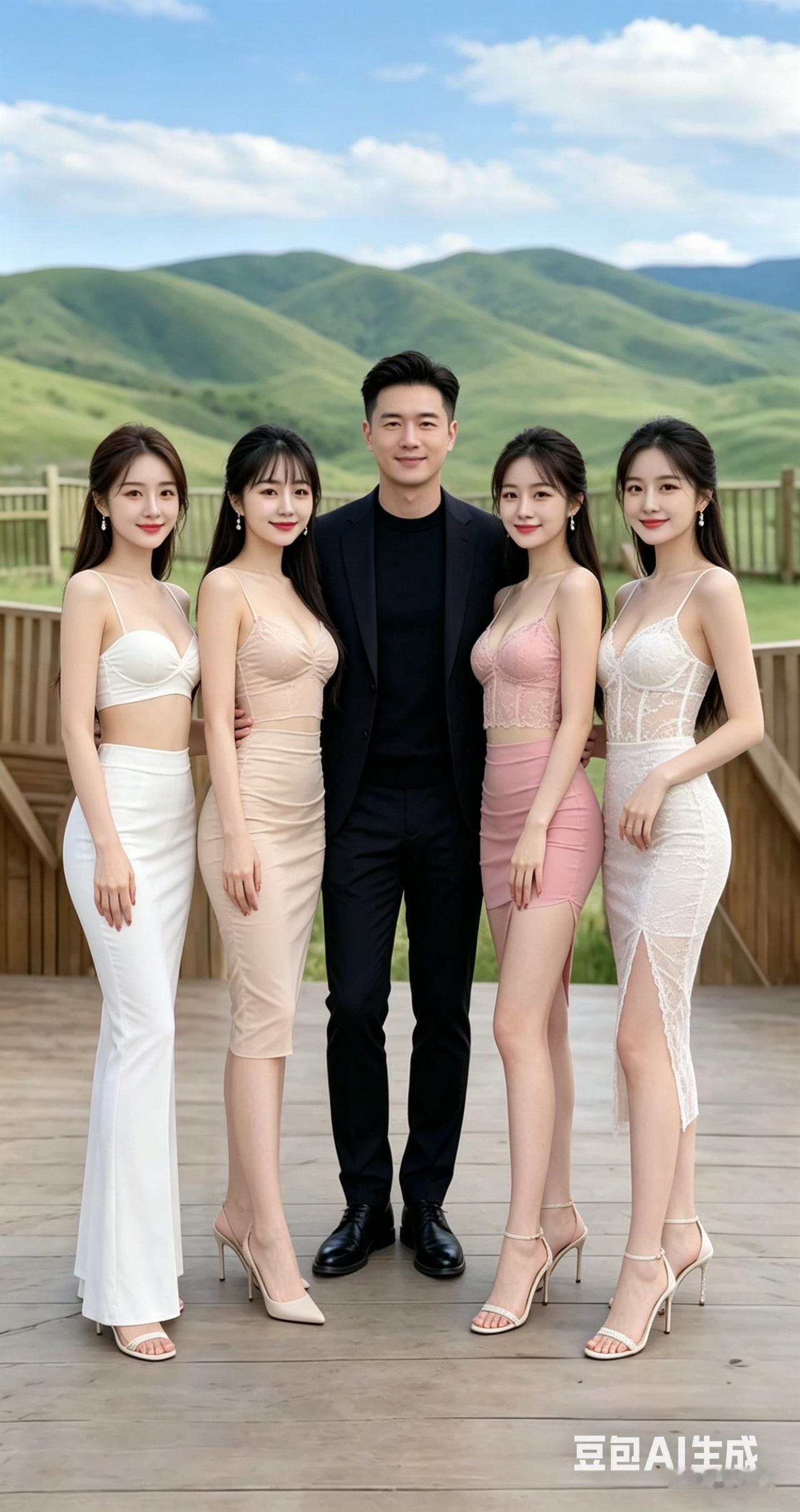 景中情 今日奇景现眼前, 一男四美入画间。 身姿婀娜皆生韵, 氛围微妙意绵绵。