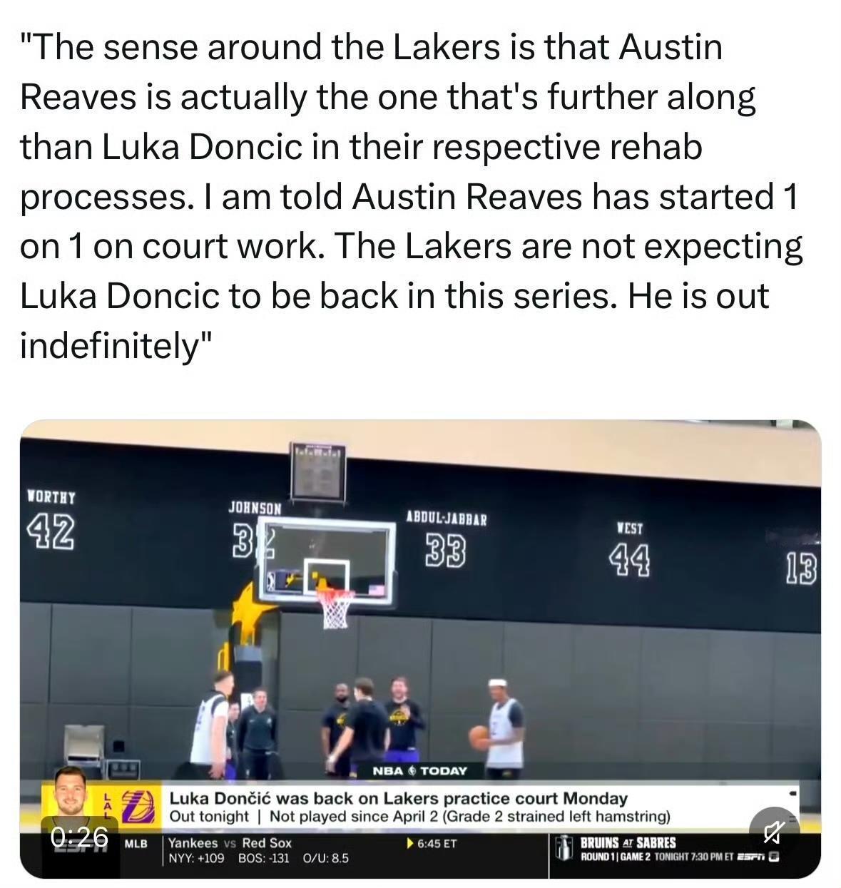Shams:东契奇预计不会在首轮复出,将无限期缺阵。里夫斯比东契奇恢复得更好。已经开始在场上进行一对一训练。 下一步将逐步过渡到三对三和五对五的对抗训练。