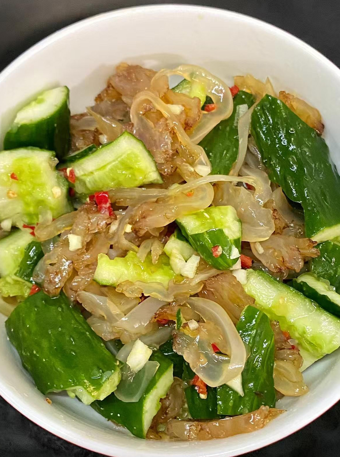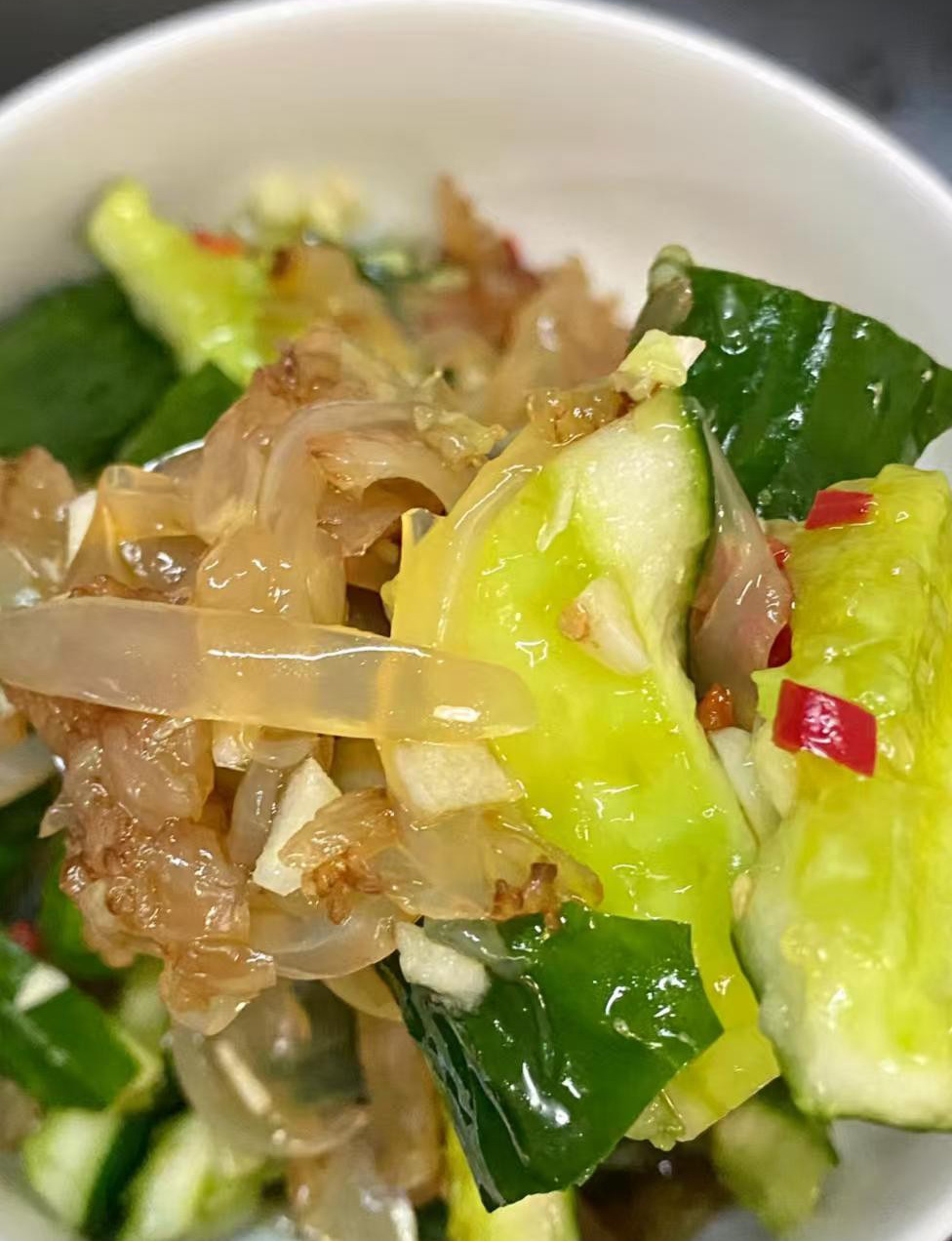 2️⃣ 海蜇拌黄瓜几分钟就能搞定的清爽凉拌菜!黄瓜拍碎,和泡好的海蜇丝一起,加蒜末、小米辣、醋、生抽、香油一拌,脆爽解腻。配粥配饭都合适,吃着清清爽爽,超舒服。