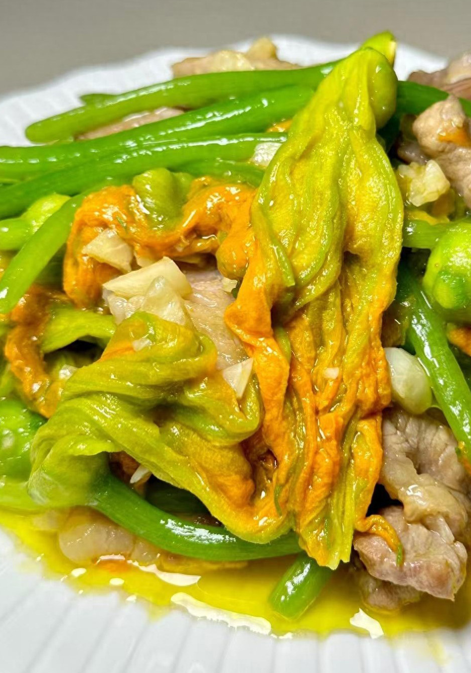 1️⃣ 南瓜花炒肉片春天的限定美味!软嫩清甜的南瓜花,和腌好的肉片一起快炒,蒜末爆香后下锅,最后勾个薄芡,滑溜溜的超下饭。自带的清甜,吃着一点都不腻,是只有春天才有的鲜味儿~