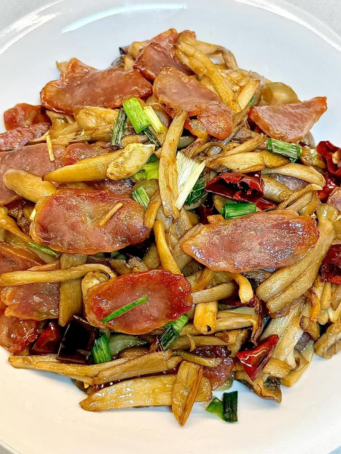 3️⃣ 鹿茸菇炒腊肠香到舔盘的下饭神器!鹿茸菇先炒干水分,腊肠煎出油脂,加干辣椒和蒜片爆香,再把菇子倒进去一起炒。菌菇吸满了腊肠的香味,干香入味,配米饭能多吃两碗!