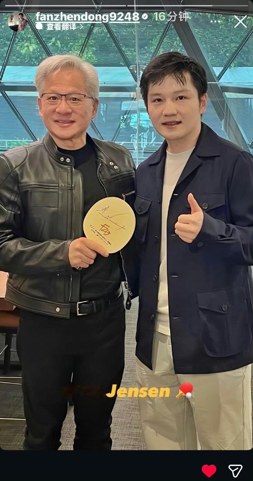 樊振东与英伟达创始人打乒乓球网友调侃🌚小胖~你的条形码劈叉了 一天两更的快乐十五岁就拿到了美国全球乒乓球公开赛的第三名。果然少年时的大佬也是大佬!大佬们都很全能啊!