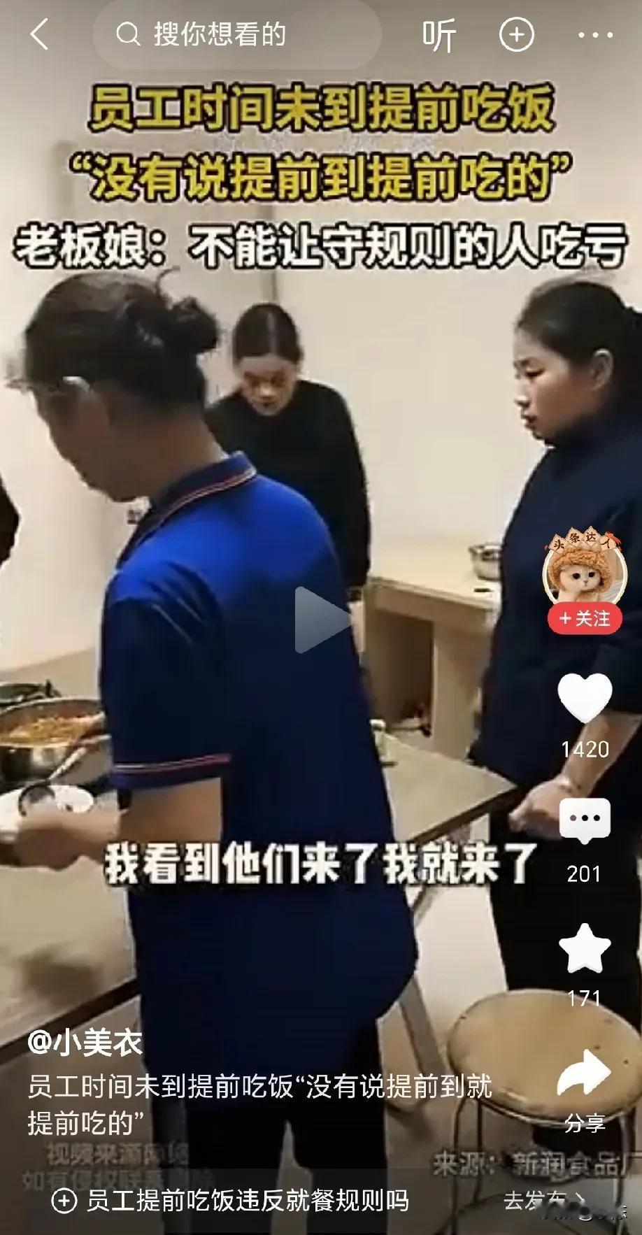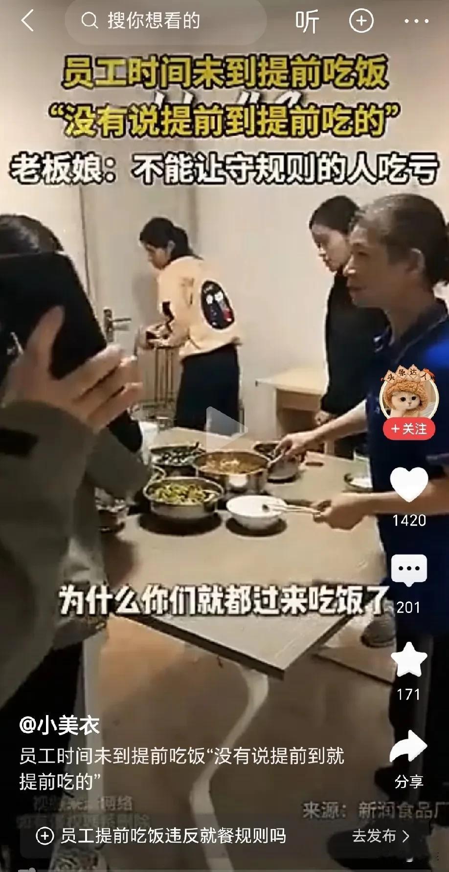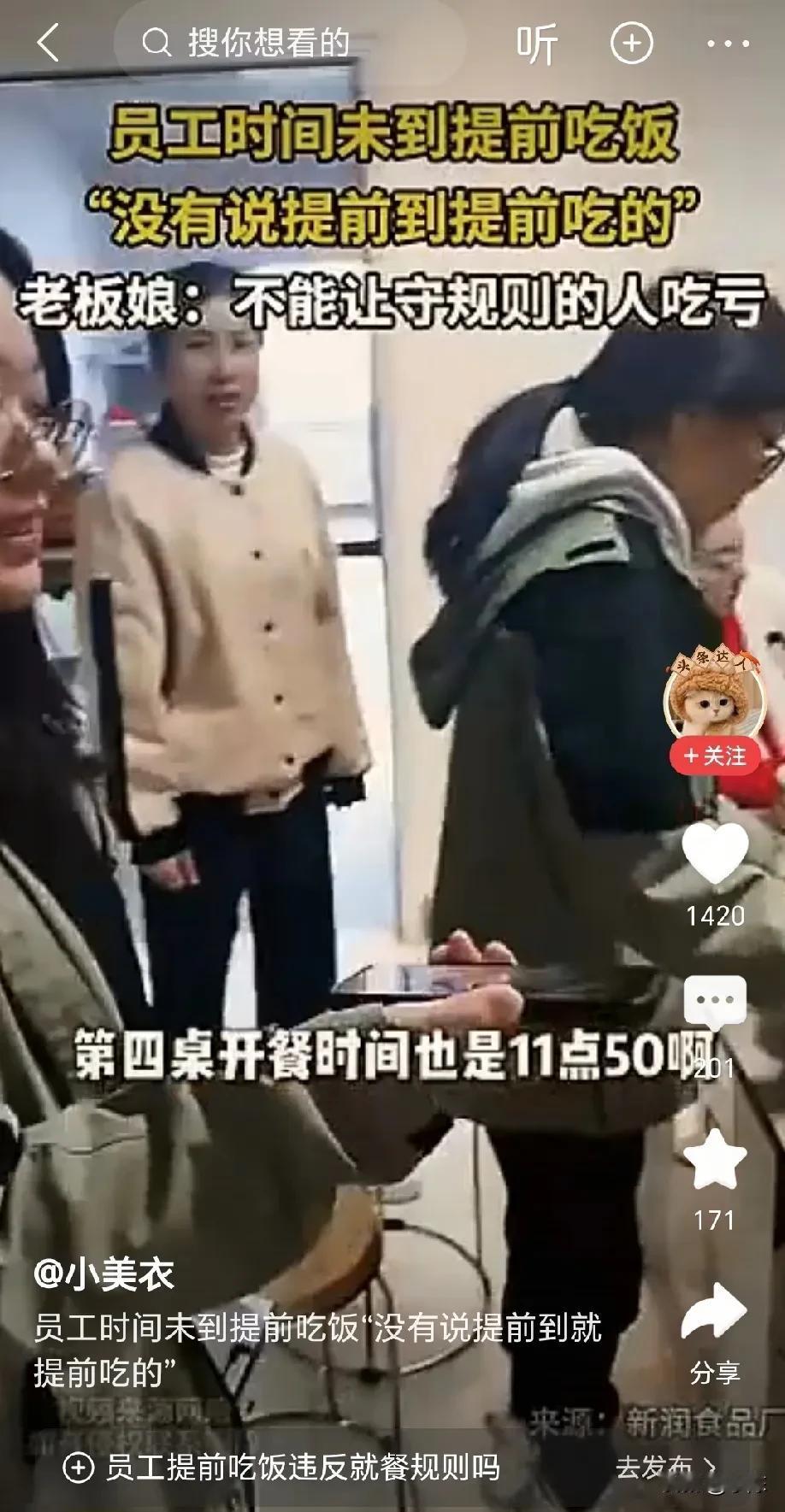 老板娘提前 1 分钟到食堂,结果已经有工人在吃饭,有的在打菜,有的则刚刚进来,老板娘质问她们:为什么你们提前吃饭,我前几天在群里通知你们 11:50 吃饭,现在才11:49 分呀,后面来晚的人怎么办?
