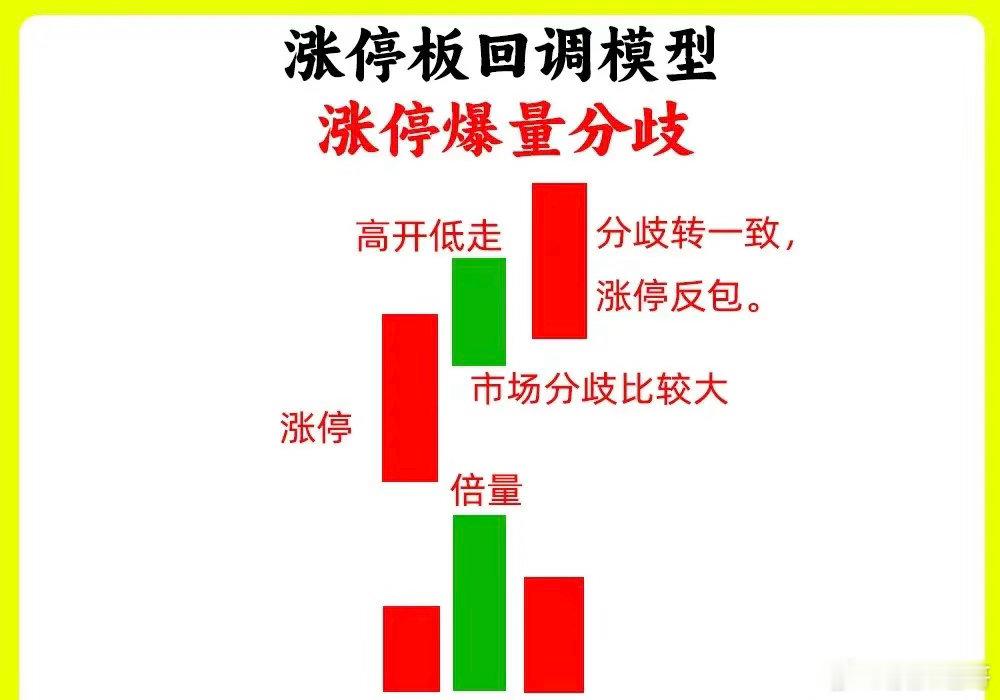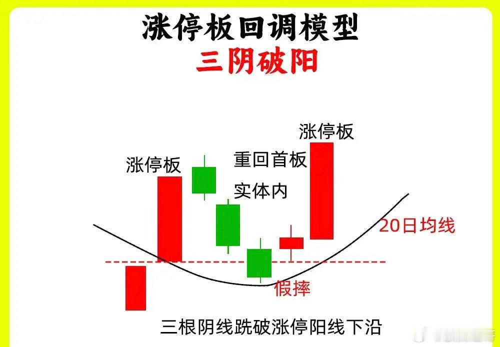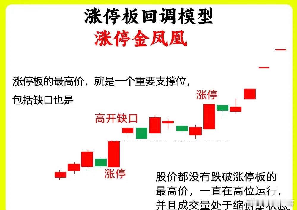 注意了!涨停回调形态,最为重要的五种,看懂这个五种形态逻辑,对于首板涨停的理解就能大大提高。不是所有的涨停都值得关注,除非是这五种。如果你还不会判断强势股,那这期文章一定要认真看完。一、三阴破阳很多人看到阴跌跌破重要支撑位就心慌,那不妨看懂这个形态。首先股价在低位出现一个首板涨停,并非是一字板而是实体涨停,次日股价开始回调下跌,出现连续三天的下跌,跌破涨停板的中位和涨停板最低价,这是我们常说的破位下跌,随后股价开始企稳止跌,反弹向上,那就不能说是有效的跌破。能在一天或两天内,重新回到支撑位的上方。所以就是主力的故意假摔,也是主力的洗盘手法,往往这种下跌过程里,成交量会出现缩量,缩量等于主力锁仓二、突破踩 5这里的5指的五日均线,首先股价在低位处于一个横盘震荡的阶段,形成一个箱体平台股价出现一个放量涨停板,突破了平台上沿,站稳五日均线,涨停次日,股价开始回调,这个时候一般是小阴线或是十字星,出现回踩五日均线以后,企稳止跌,这里的回踩不破,代表支撑有效,就代表股价已经进入另一个区间。从下方的案例就可以看出现股价先是横盘、突破、回踩、趋势延续的一个过程三、涨停爆量分歧可以认为是主力空中加油,这个时间会比较快。首先股价是出现一个涨停,可以连板,一般板块龙头上出现比较多。次日股价冲高回落,高开低走,形成比较长的上影线,实体收盘反而很小,通常成交量出现放量,往往是倍量或是巨量,说明这天有很强的分歧,很多筹码在这个位置换手。随后股价再次出中大阳线或是涨停板,反包了阴线。说明下方承接力量很强,主力并没有放弃。这就是典型的分歧后转一致。四、N 字涨停板这是比较经典一个走势,股价在低位经过长时间的横盘以后,出现首板涨停,随后股价开始回落,在五日回调过程里,一般是小阴线小阳线或是十字星,同时成交量出现缩量。这是主力洗盘手法,短期调整。随后股价再次出现放量涨停,趋势延续,这个主力控盘的一个过程。四个字概括就是短洗快拉五、涨停金凤凰这是最为强势的涨停回调形态,为什么说是强势的。首先股价出现首板涨停,次日股价开始回调,早盘高开,形成一个缺口在整个回调的过程里,一般会在7个交易内,股价都首板涨停的最高价上方运行,都没有跌破涨停板的最高价,同时也不会去回补这个高开的缺口,主力已经高度控盘,这个就是金凤凰的凤身随后股价再次启动,这个就是凤尾。市场有一句俗语,涨停不破高,后市必有妖,指的就是这种形态了还了!以上就是涨停回调的五种形态,下个我放了对应案例图,一定要认真看完。希望对大家有启发,也是最为基础的内容,一定吃透。我们下期内容再见