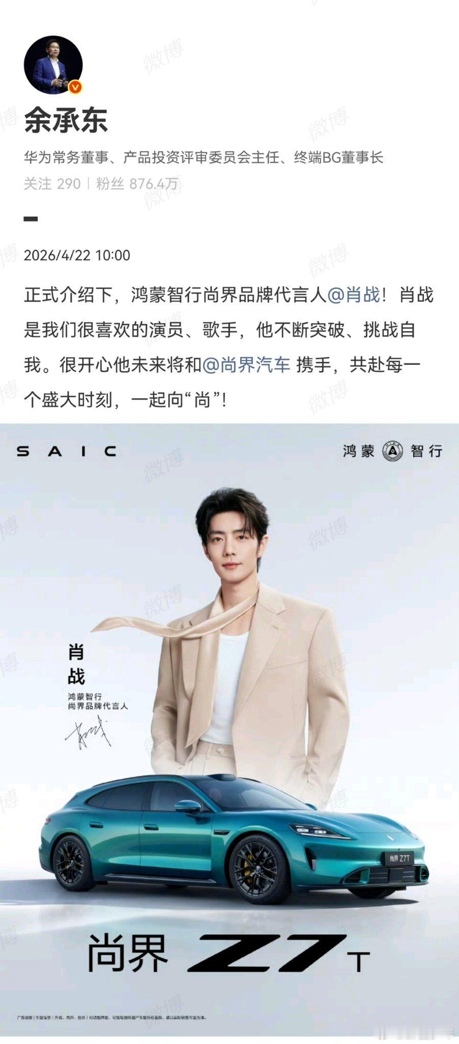 余承东和华为很喜欢肖战和肖战一起向尚顶流实力获硬核品牌青睐,余承东亲自官宣认证喜爱,肖战与鸿蒙智行尚界同行,并肩向上共启全新篇章