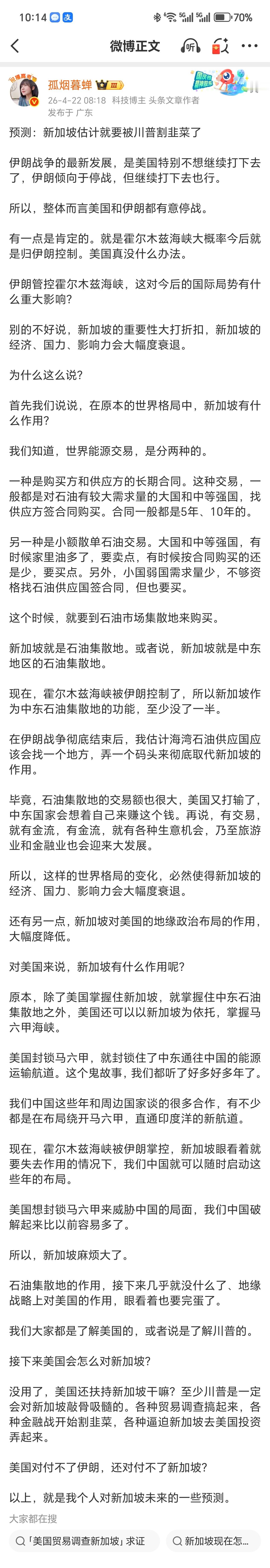 大V:大概率新加坡就要被老特割韭菜了