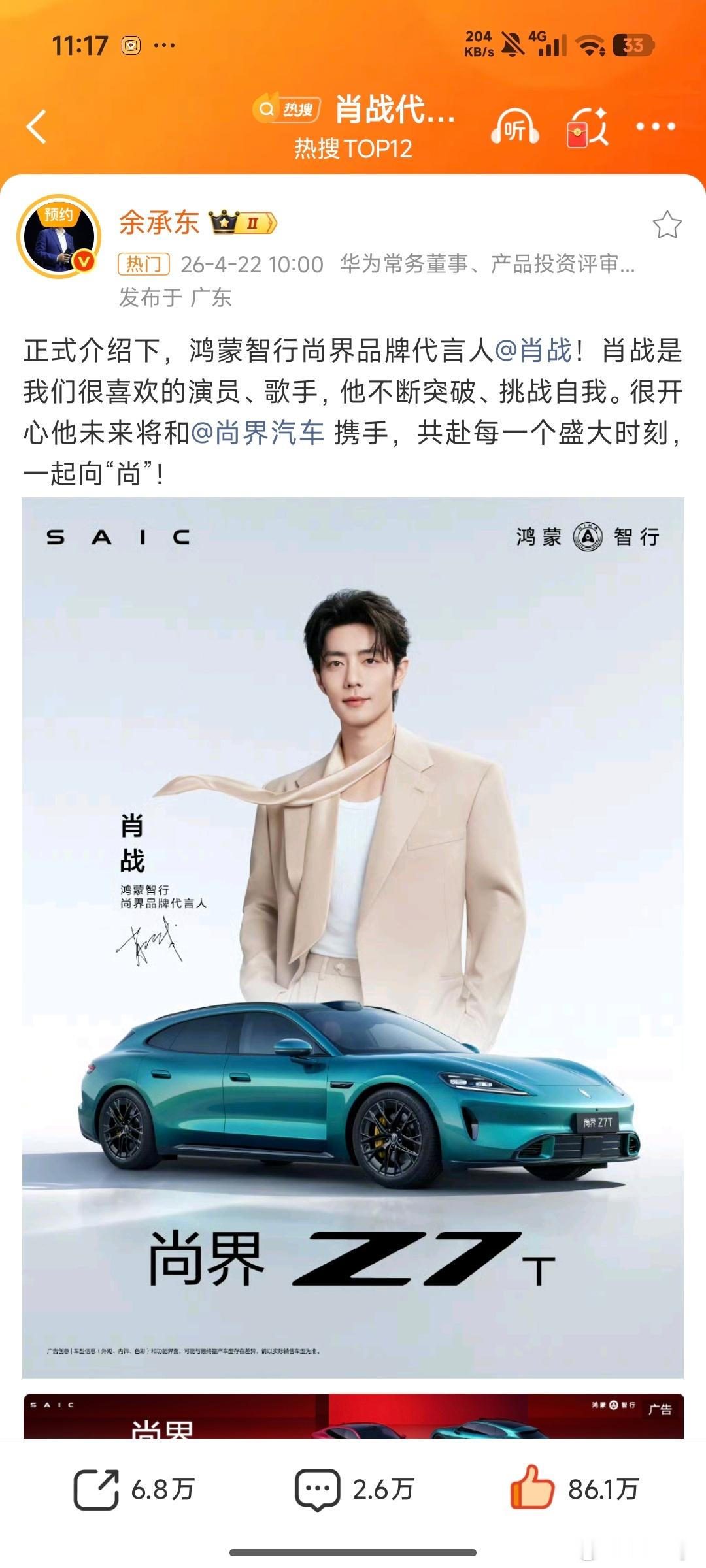肖战代言的尚界Z7上了热搜。之前肖战也代言过上汽奥迪,为什么没这个效果?总有一方