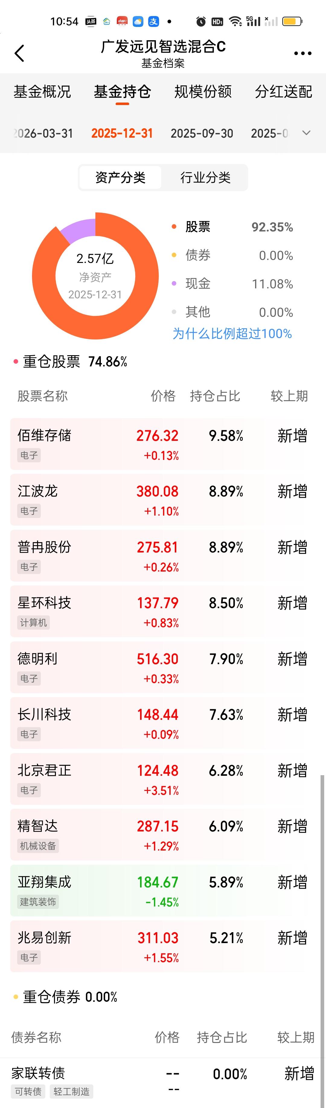 这只基金历来调仓换股的幅度都非常大,这次也不例外。一共调入7只新的个股,和我们之前预测的差不多。长飞光纤,中天科技,亨通光电,杭电股份全部调入。此外还有协创数据,宏景科技,国科微。调出的7只个股是江波龙,普冉股份,星环科技,长川科技,北京君正,精智达,兆易创新。另外把佰维存储,德明利的仓位降低了一些。