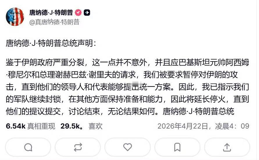 之所以延长,特朗普称是鉴于“伊朗内部的严重分歧”,以及巴基斯坦总理和陆军参谋长的请求。