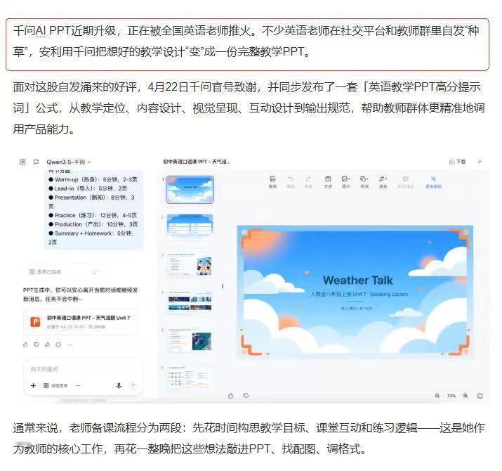 另外我从社交平台上看到了很有意思的一幕,很多老师居然扎堆用千问生成PPT课件,甚至因为使用人数太多,需要排队才能用上。