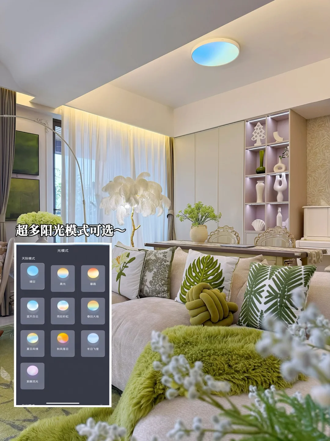 1800K-12000K全色域高显指,色温自由调节,一年四季十二时辰,都有属于小家的专属氛围。九种阳光模式,还原不同时段天空色,光感节律超治愈。