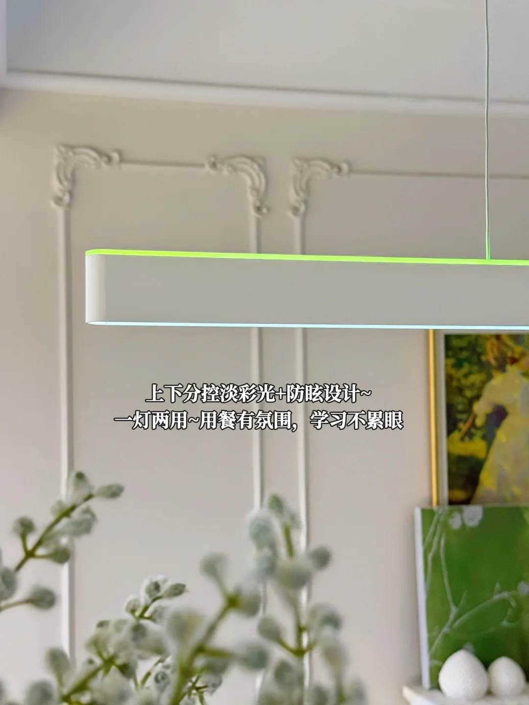 而这款灯上下光独立可调,还自带彩光氛围玩法。上层漫射彩光自定义调色,打亮天花板温柔又高级;下层暖光聚焦餐桌,三餐仪式感拉满,俩娃吃饭都更香了。