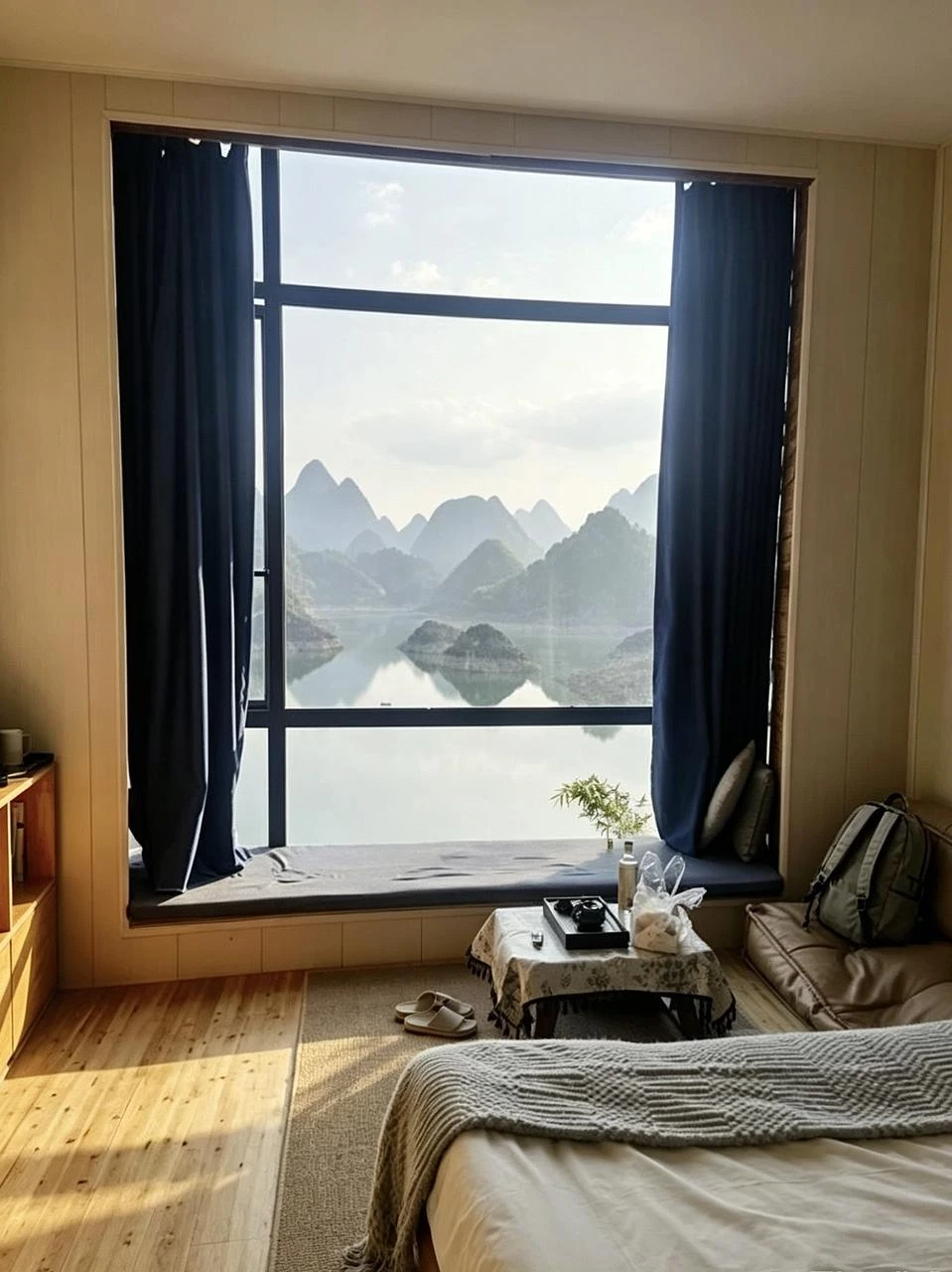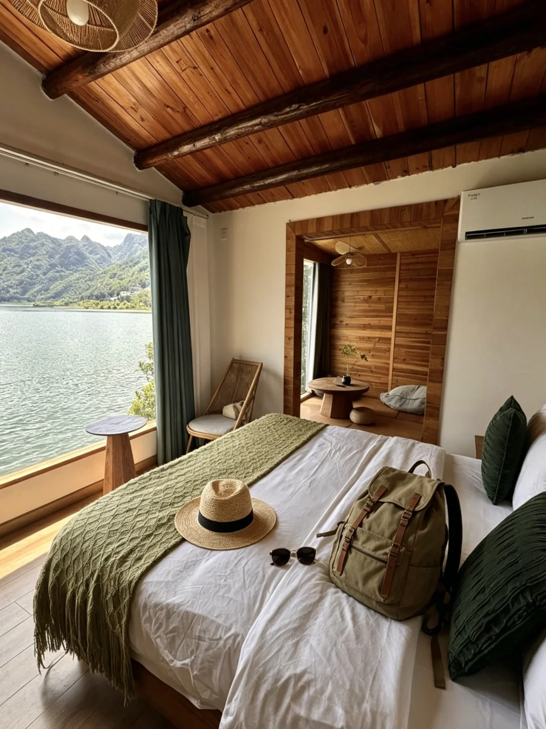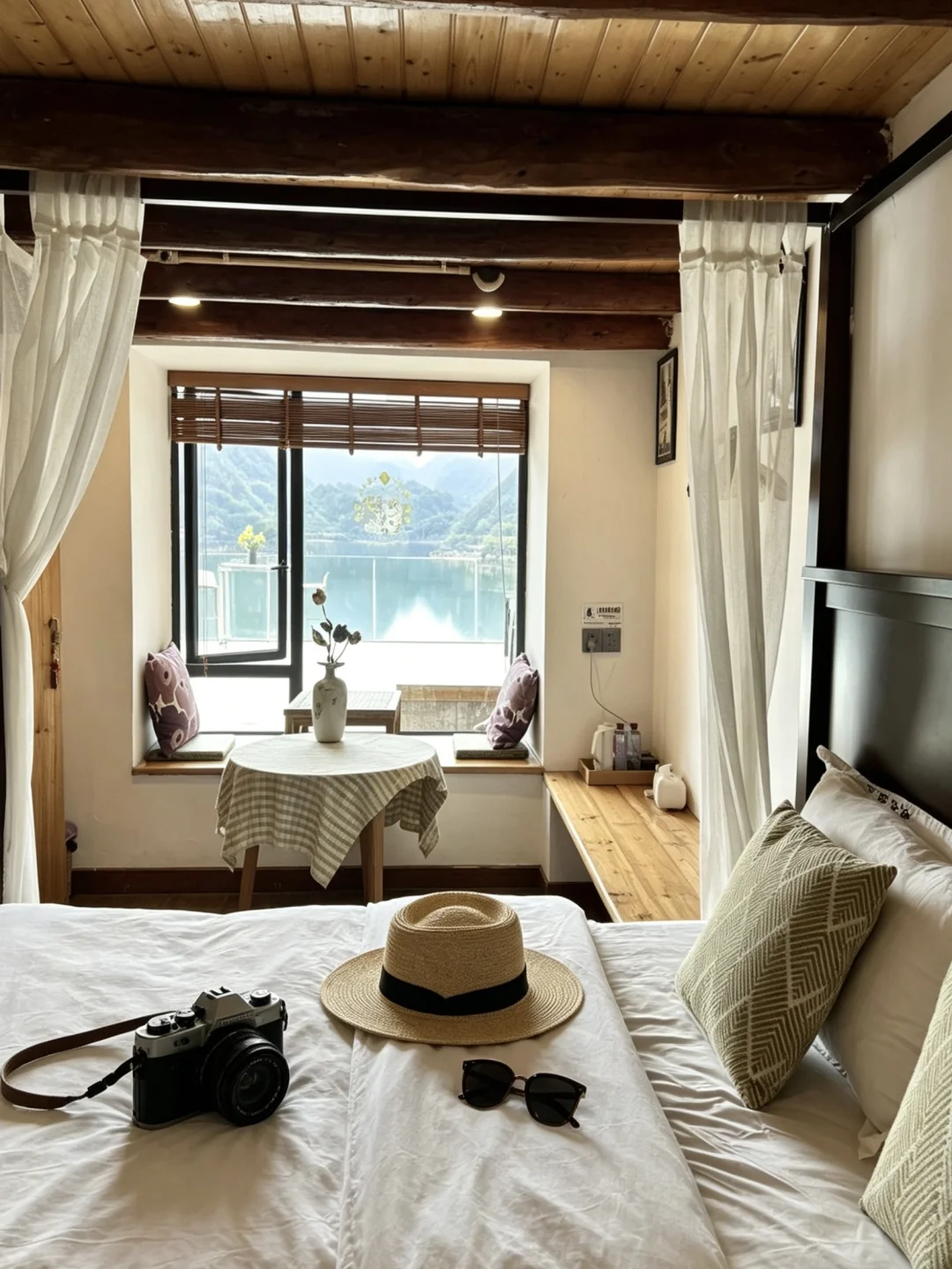 ✅推开窗就是水墨湖景,青山环绕,完全是逃离城市喧嚣的世外桃源,假期来放空再舒服不过。
