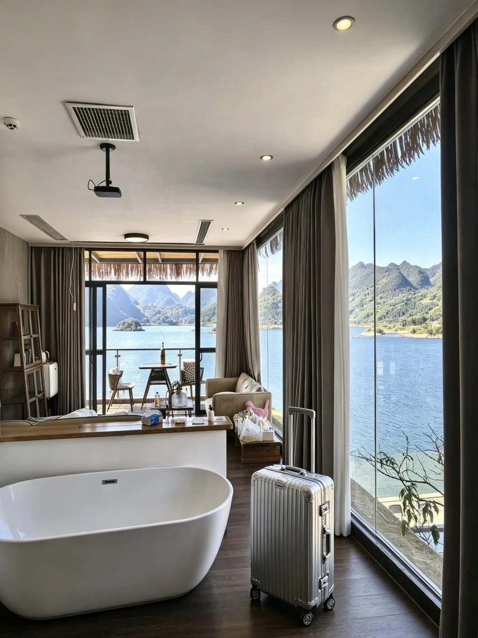 ✅房间干净整洁,床品舒服,部分房型带大投影、智能马桶,阳台品茶看湖景,很有度假感。