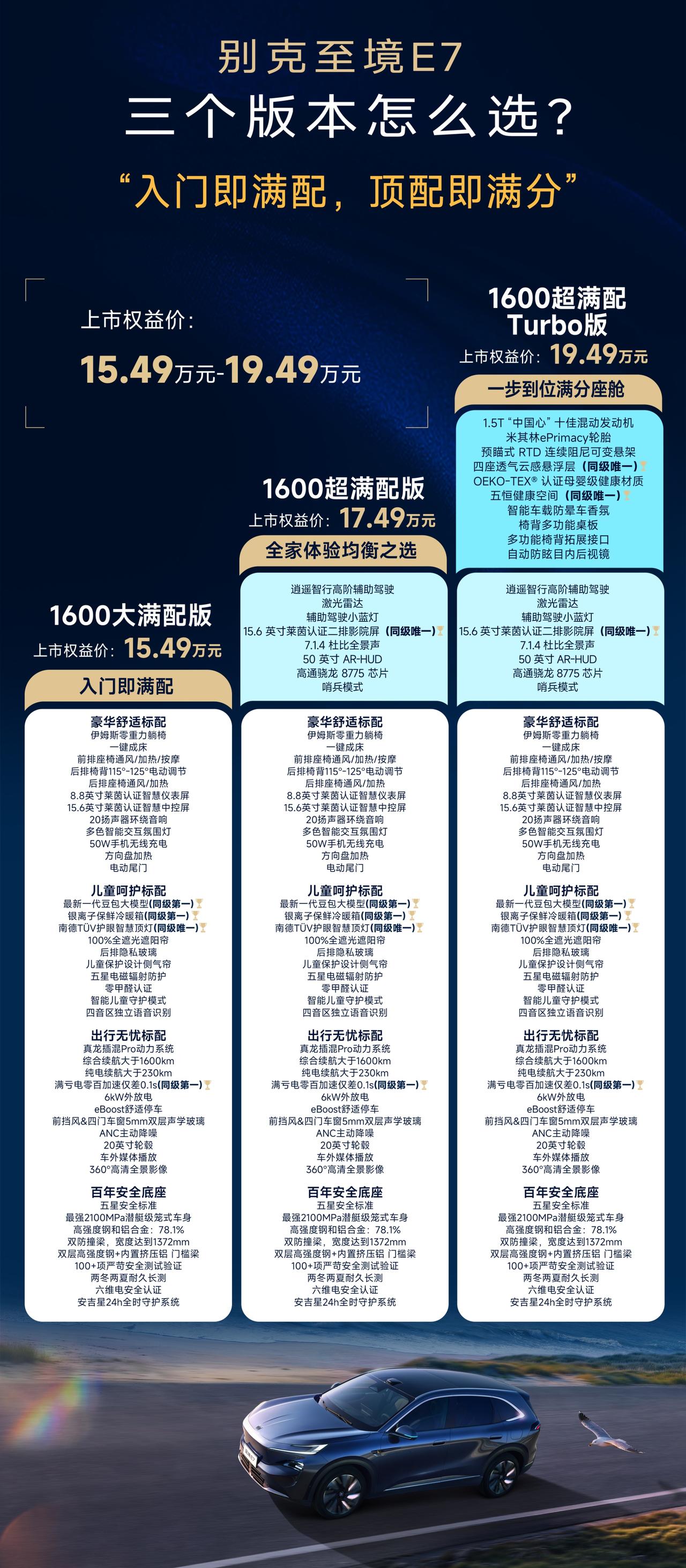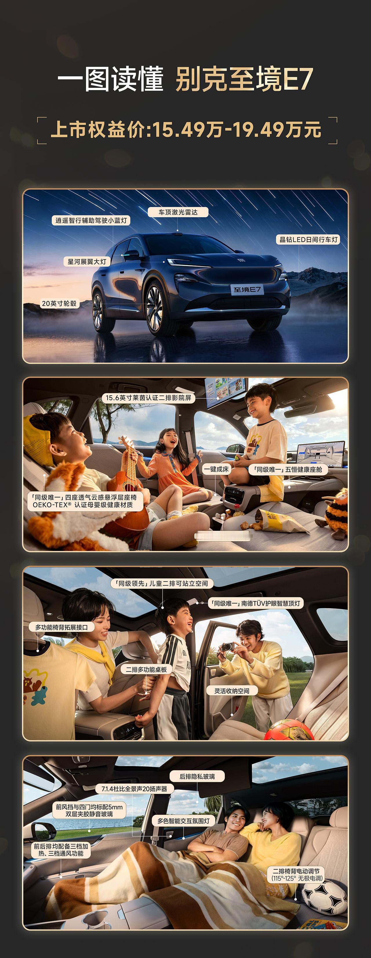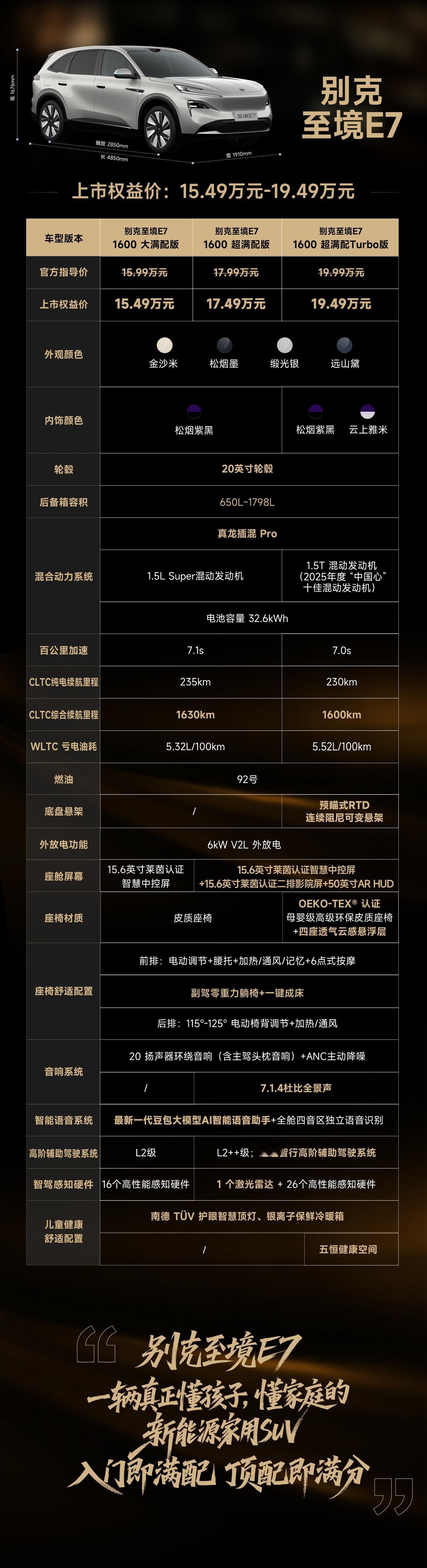 车盟快讯:今天中午,别克至境E7正式上市并开启交付,上市权益价15.49万-19.49万元,现在下订还可享“满分置换补贴礼”以及三电终身质保、1999元享“金石之约”换新保障等重磅权益,此次新车主打一个入门即满配,因此在预售阶段,便以收获超3万台的订单,作为一款深度聚焦中国成长型家庭需求的新能源大五座SUV,别克至境E7以无短板的全能实力,成为20万内家用新能源SUV产品卷王,大家对这个价格还满意吗?