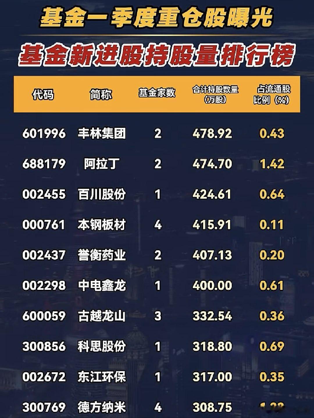 A股 一季度,基金新进股持股量排行