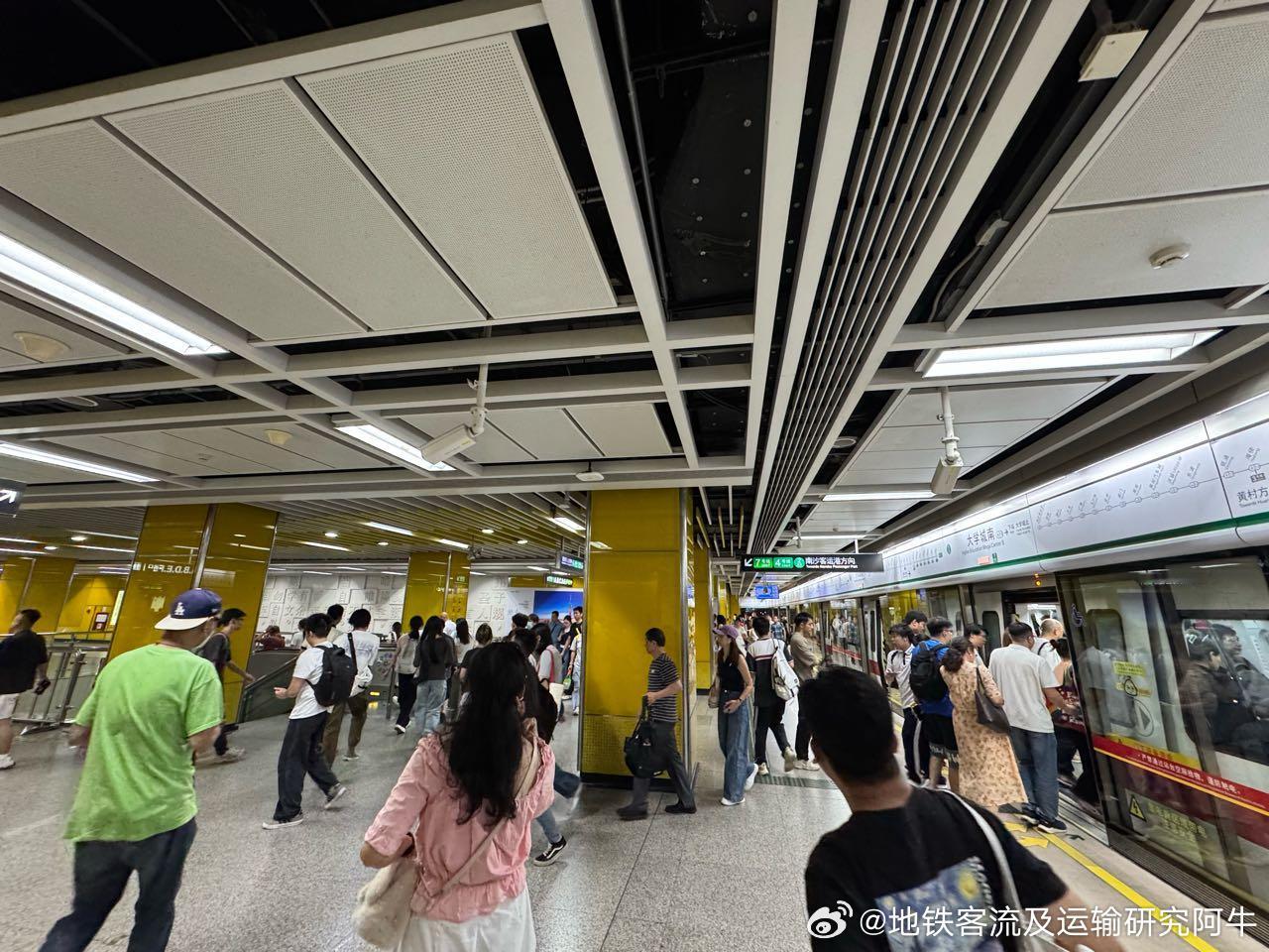 广州地铁 网友:2026年4月22日(周三)广州地铁晚高峰前客流画面投稿。图1为16:54广州地铁4号线(4L,间隔5分钟)新造站1站台候车客流;图2为16:56广州地铁4号线新造→大学城南客流;图3为16:58广州地铁4号线大学城南站出站及前往换乘7、12号线客流。——今日广州地铁总客流预计如何?能否保持990+?