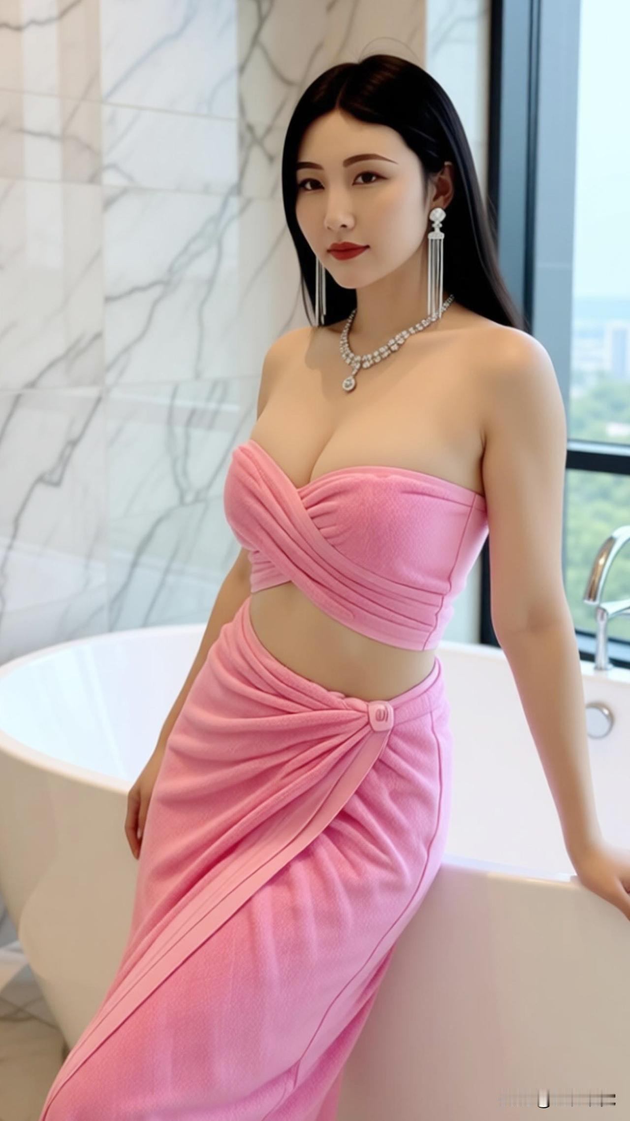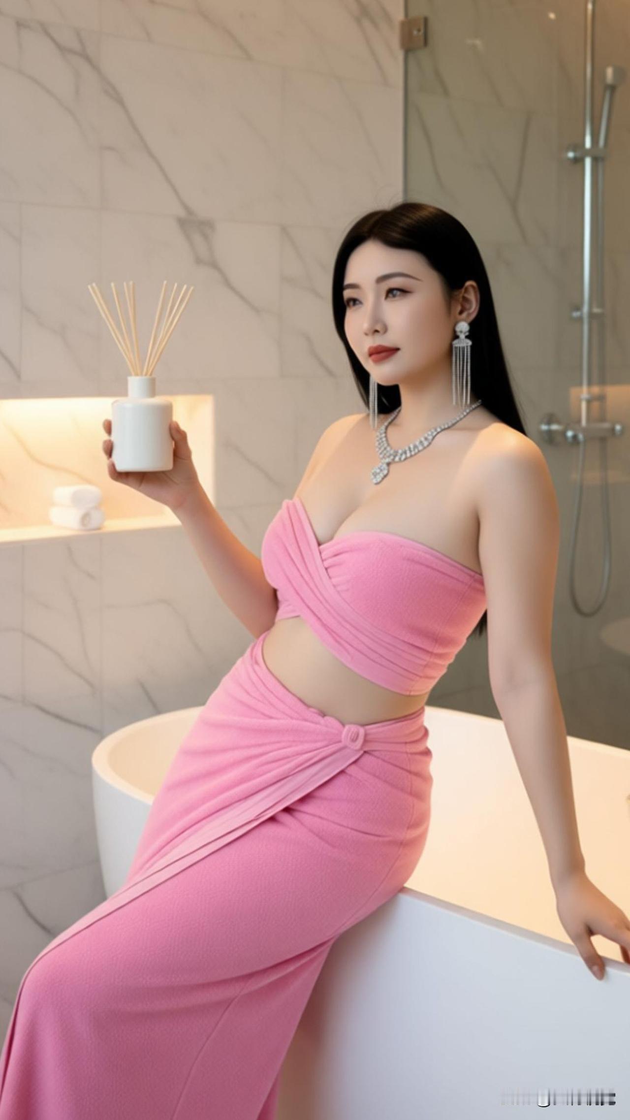 苏念念小姐姐 真是太美了,柔粉抹胸套装裙裹着温婉气质,斜倚在洁白浴缸边,大理石墙面晕着细腻光泽。长发垂落如墨,流苏耳饰轻晃,颈间细链衬得脖颈愈发修长。侧颜静立,似将喧嚣隔绝,只剩松弛与优雅在空间里漫开,像一首无声的温柔诗,把慵懒的午后时光,酿成独属于她的静谧浪漫。