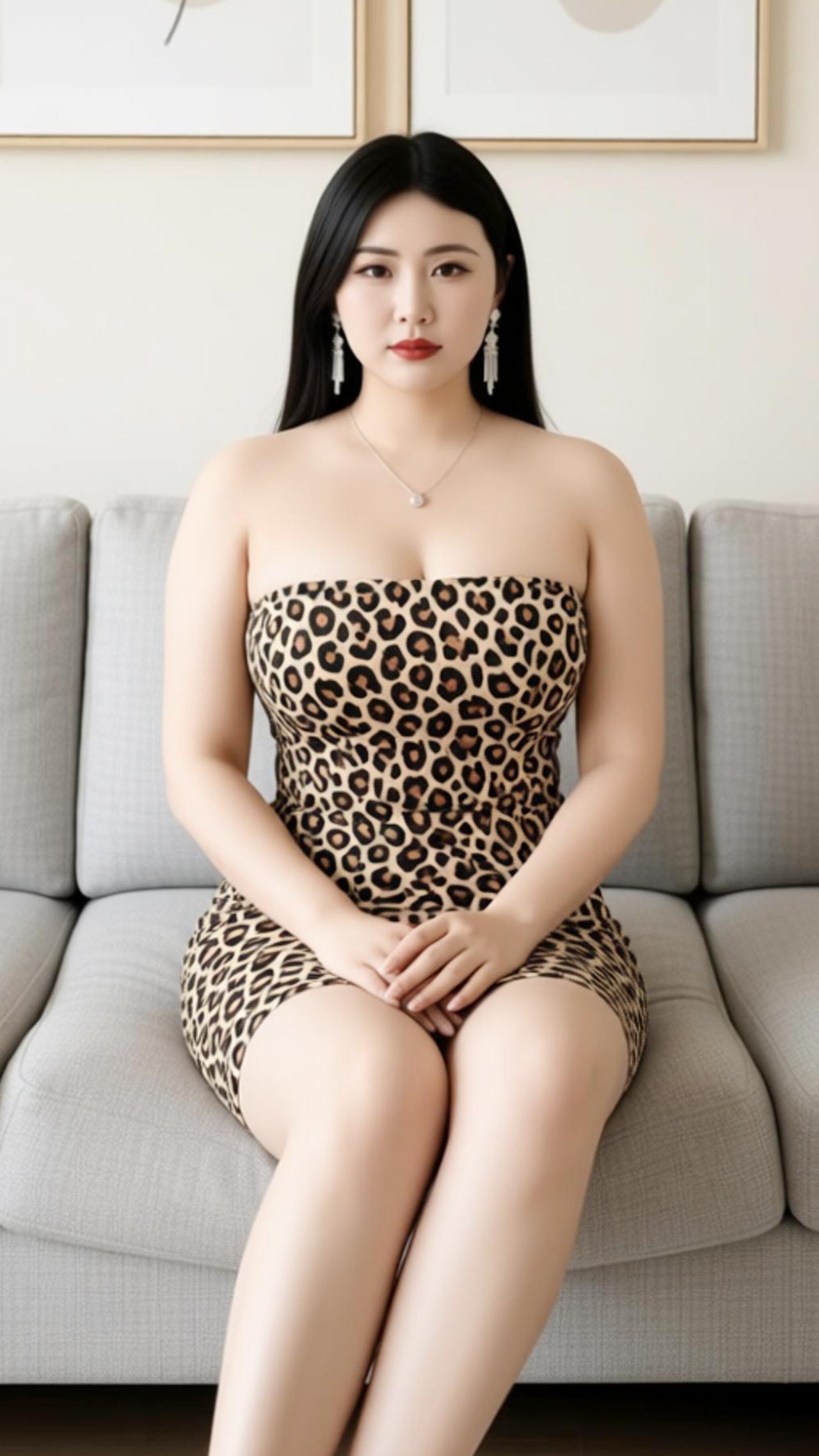 苏念念身着豹纹裙斜倚其上,赤足轻搭在米白地毯上。复古野性的纹路衬得身姿愈发曼妙,