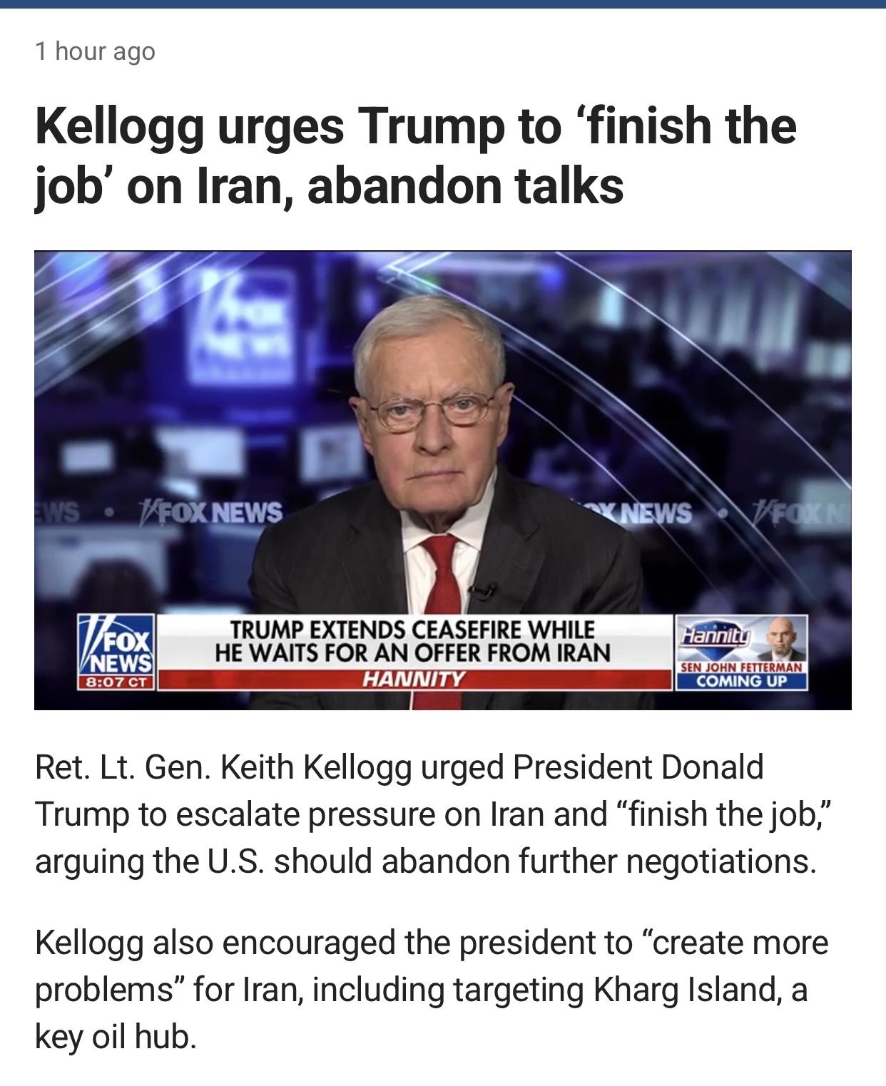 报道的原标题是《Kellogg urges Trump to ‘finish the job’ on Iran, abandon talks》(凯洛格敦促特朗普把伊朗问题上“搞定”,放弃谈判)。