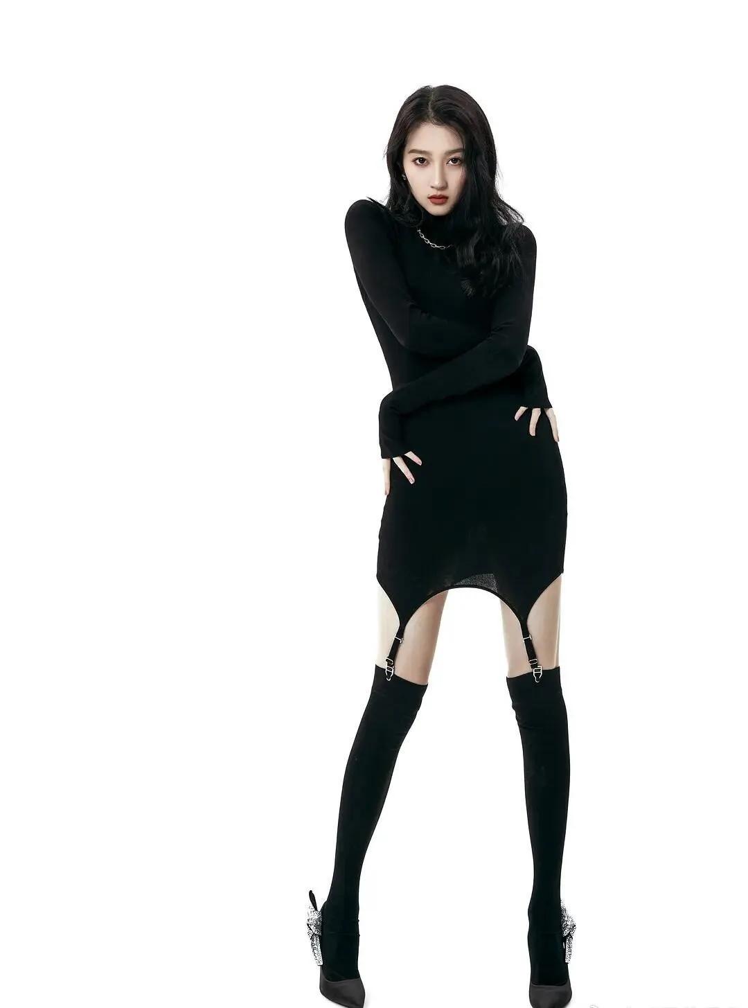 优雅黑裙,红唇诱惑,楼梯上的时尚女王