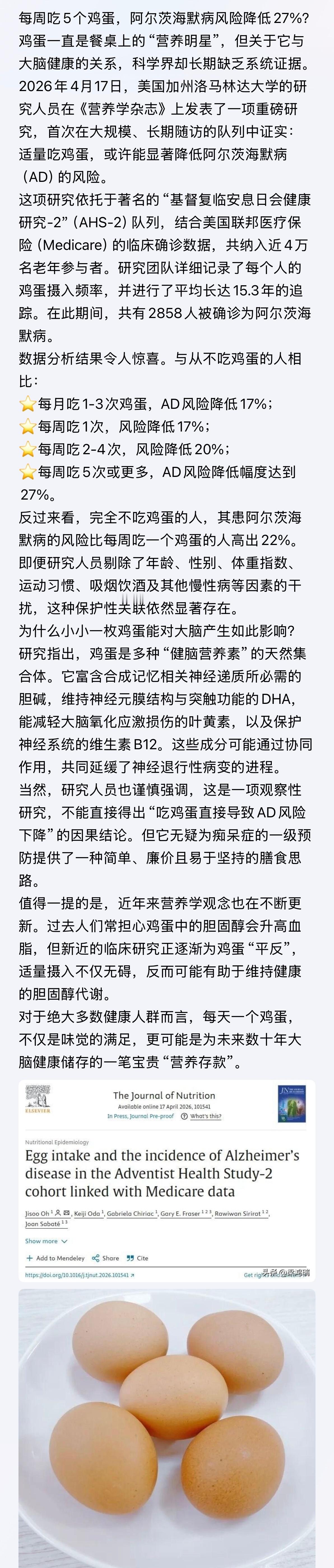 每周吃5个鸡蛋,阿尔茨海默病风险降低27%?…