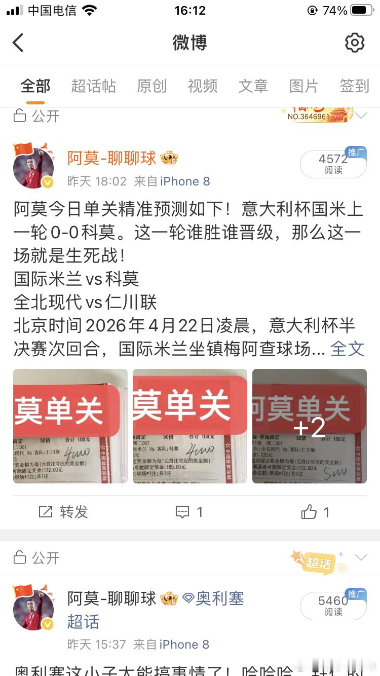 阿莫昨晚单关意大利杯国际米兰vs科莫成功又又又又拿下了,成功精准打击!国米牛逼让2追3!太帅了!跟上的小伙伴们已经吃排骨了!小伙伴们有需要更多精准足球篮球赛事资讯的,请到阿莫置顶粉丝👗1裙来找阿莫哈!足球预测足球竞彩推荐竞彩足球