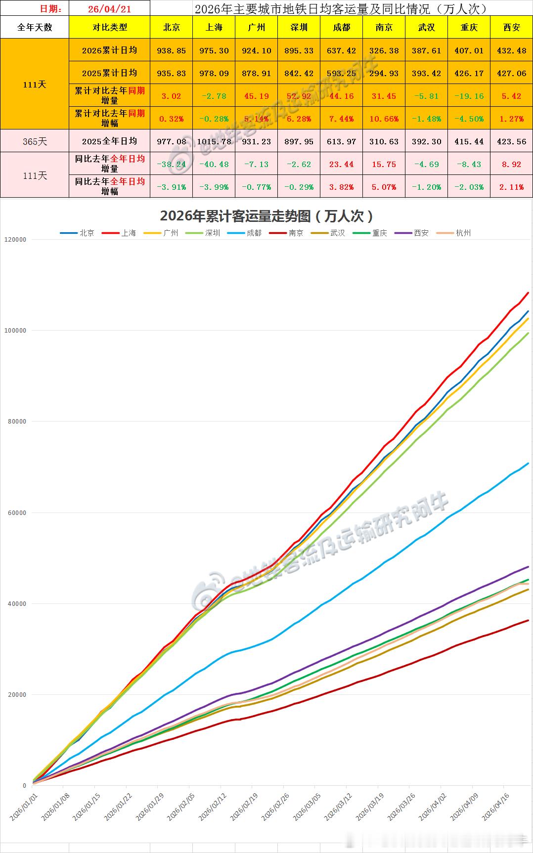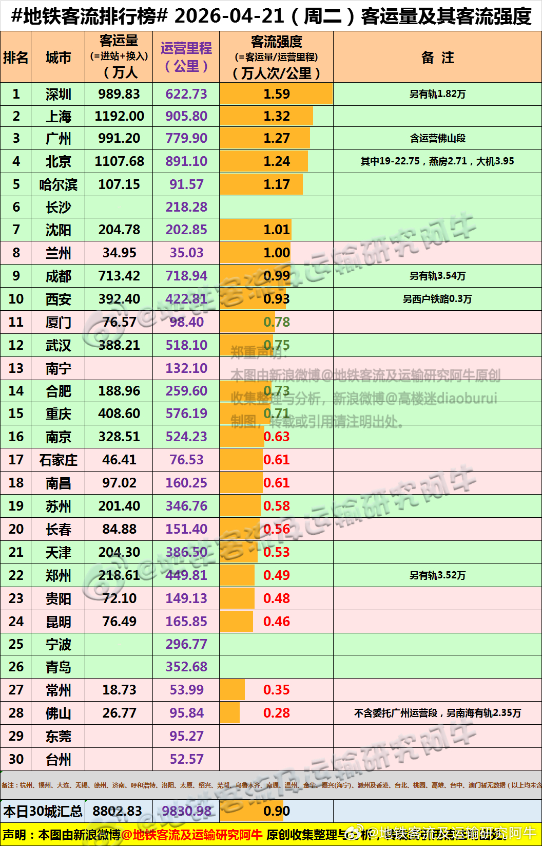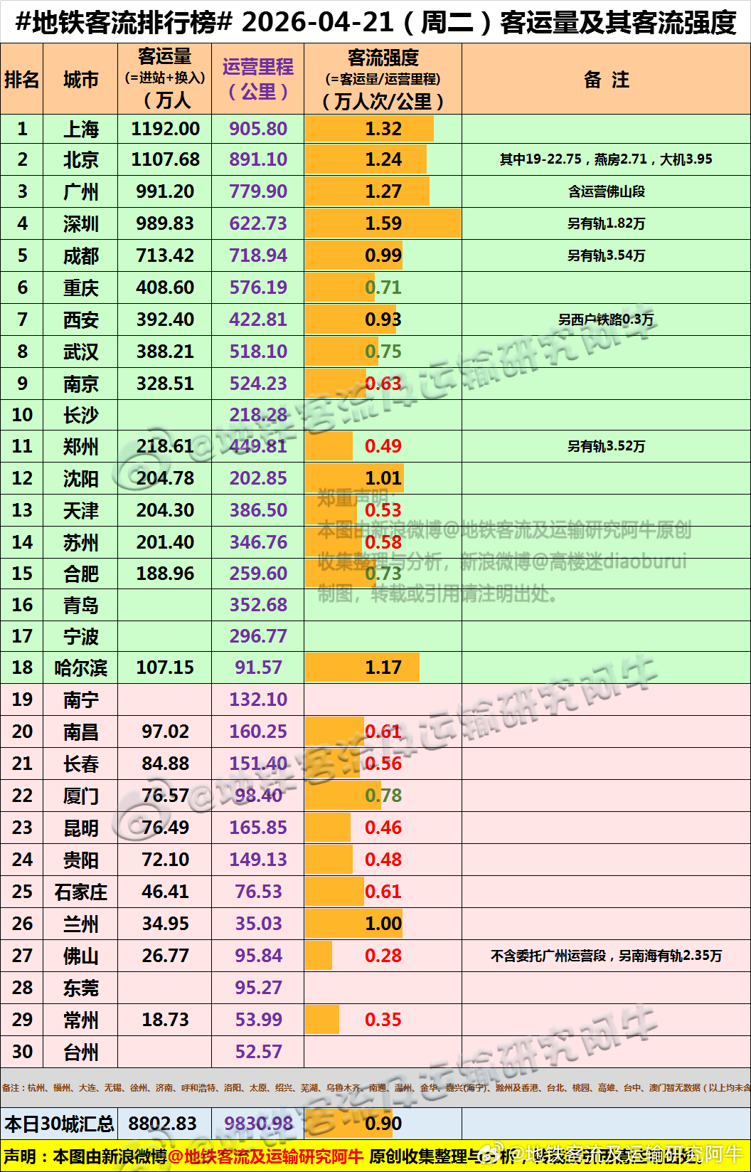 【中国城市地铁客流排行榜 2026-04-21(周二,农历三月初五,中国地铁客流日报】上海1192万,北京1107.68万(其中19-22.75,燕房2.71,大机3.95),广州991.2万,深圳989.83万(另有轨1.82万),成都713.42万(另有轨3.54万),重庆408.6万,西安392.4万(另西户铁路0.3万),武汉388.21万,……余见下表(1-客运量排序,2-客流强度排序)上海地铁北京地铁广州地铁深圳地铁成都地铁重庆轨道交通西安地铁武汉地铁南京地铁长沙地铁地铁客流及运输研究阿牛的微博