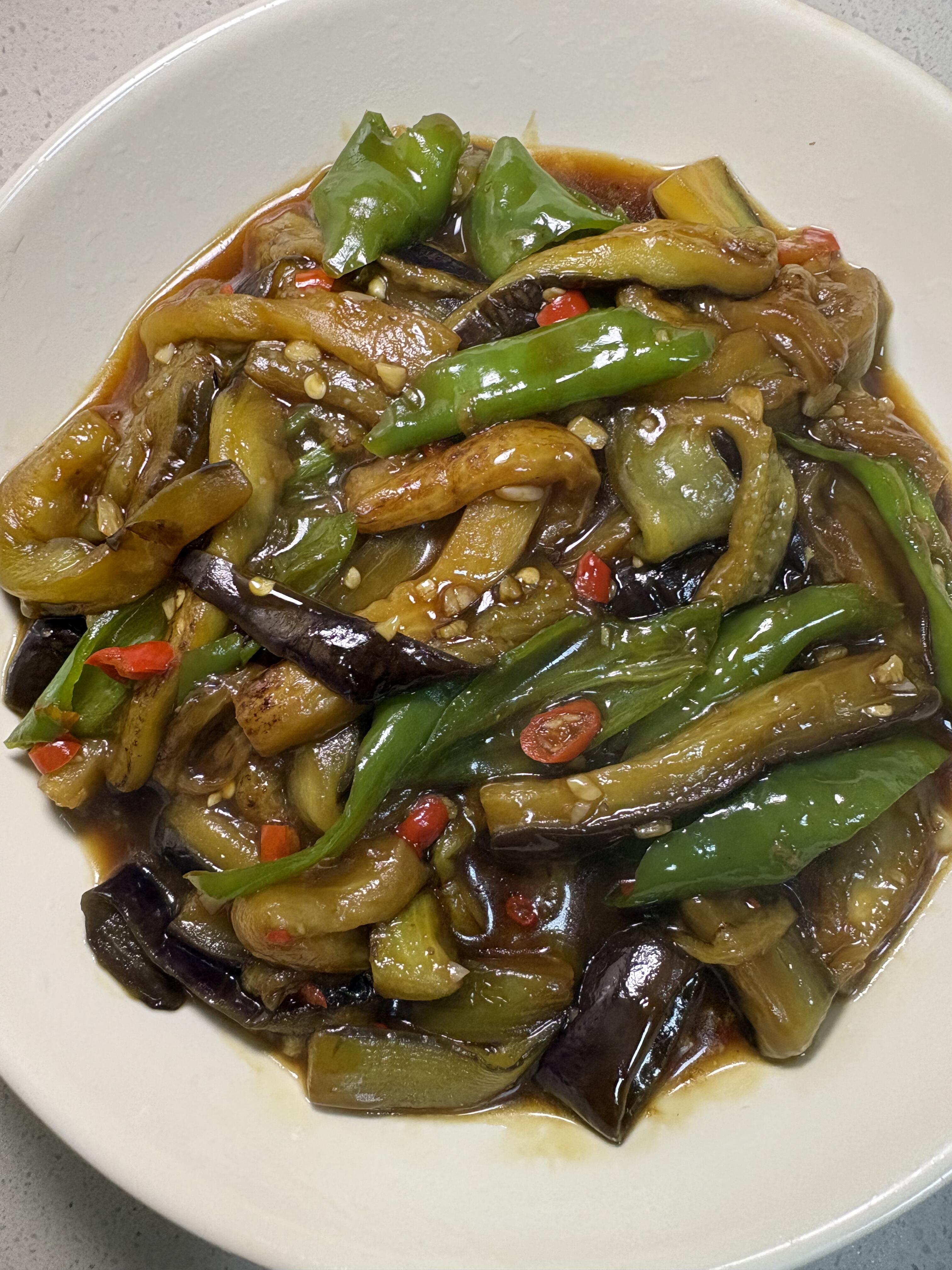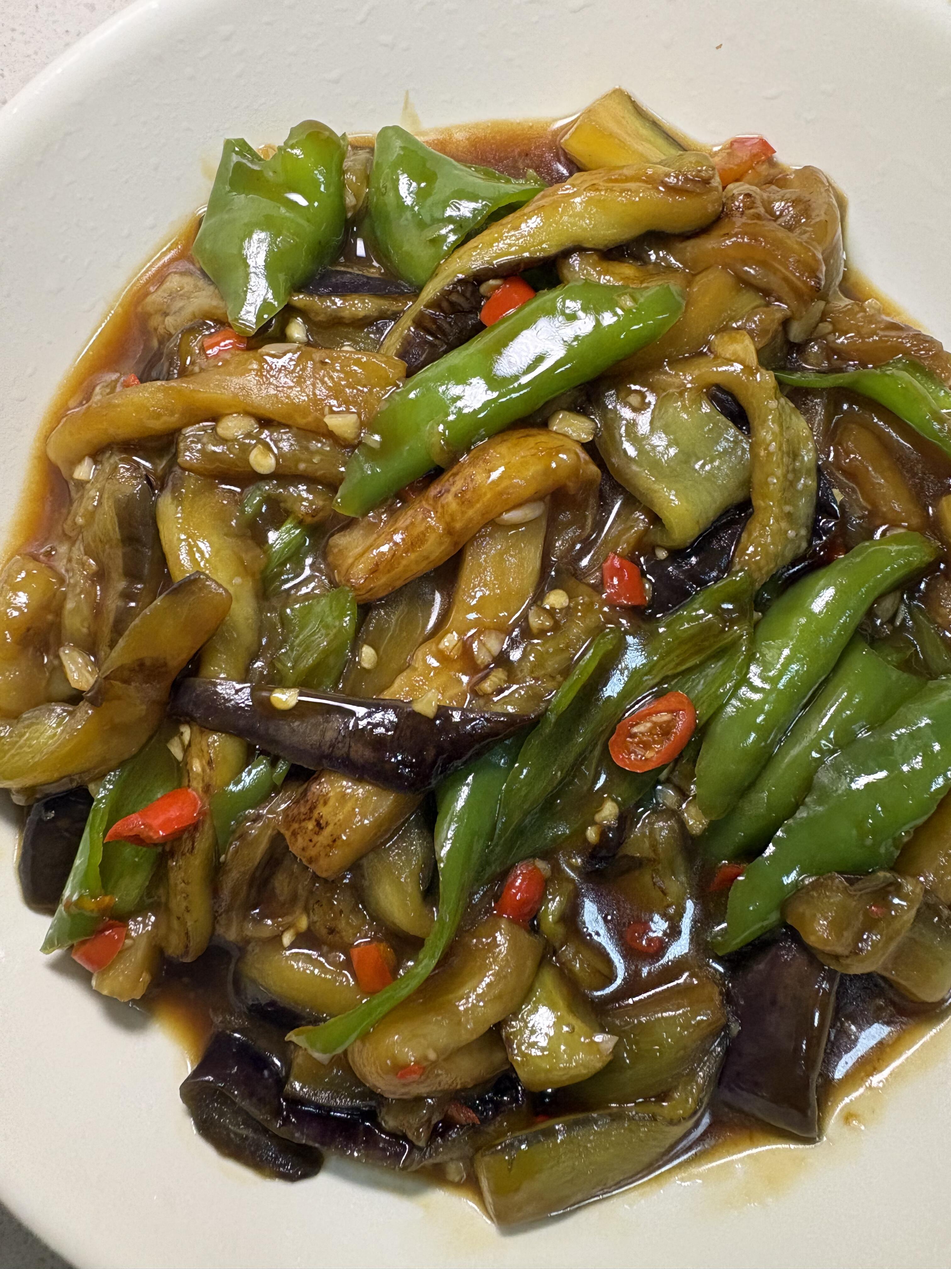 2. 油热后把茄子炒软,放辣椒、蒜末炒香,再放青椒炒至断生