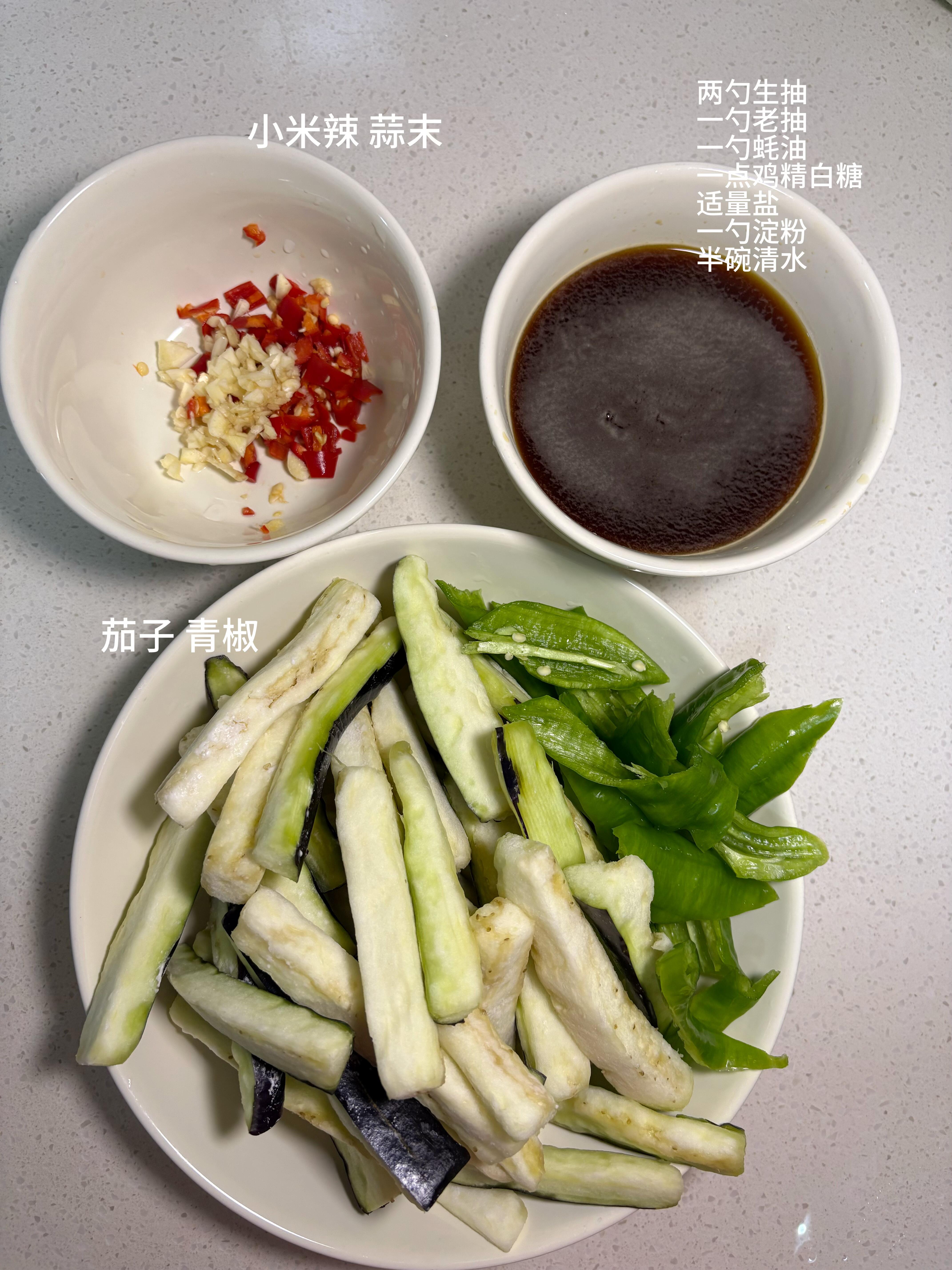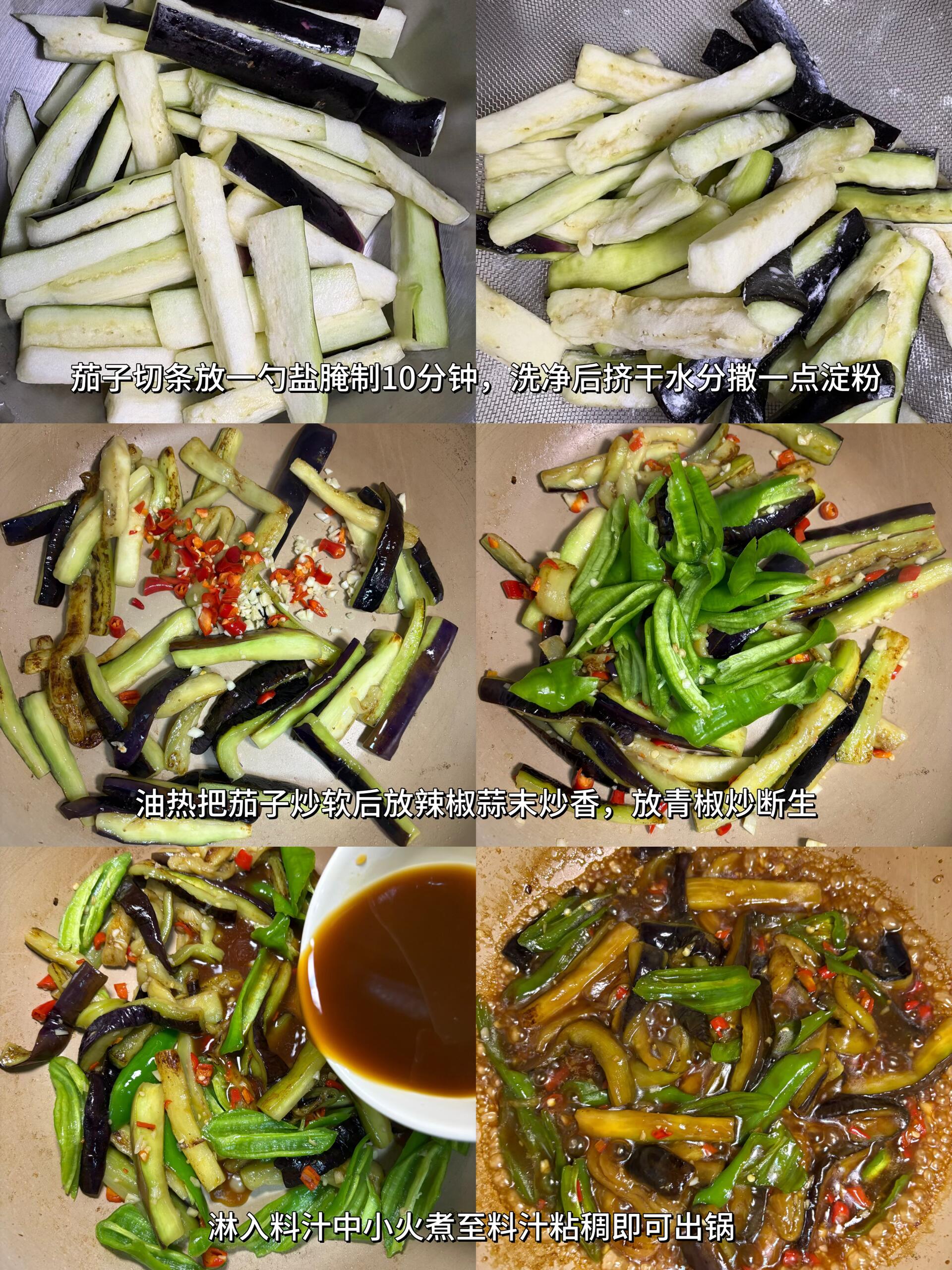 1. 茄子切条,放一勺盐腌制10分钟,洗净后挤干水分,撒一点淀粉抓匀