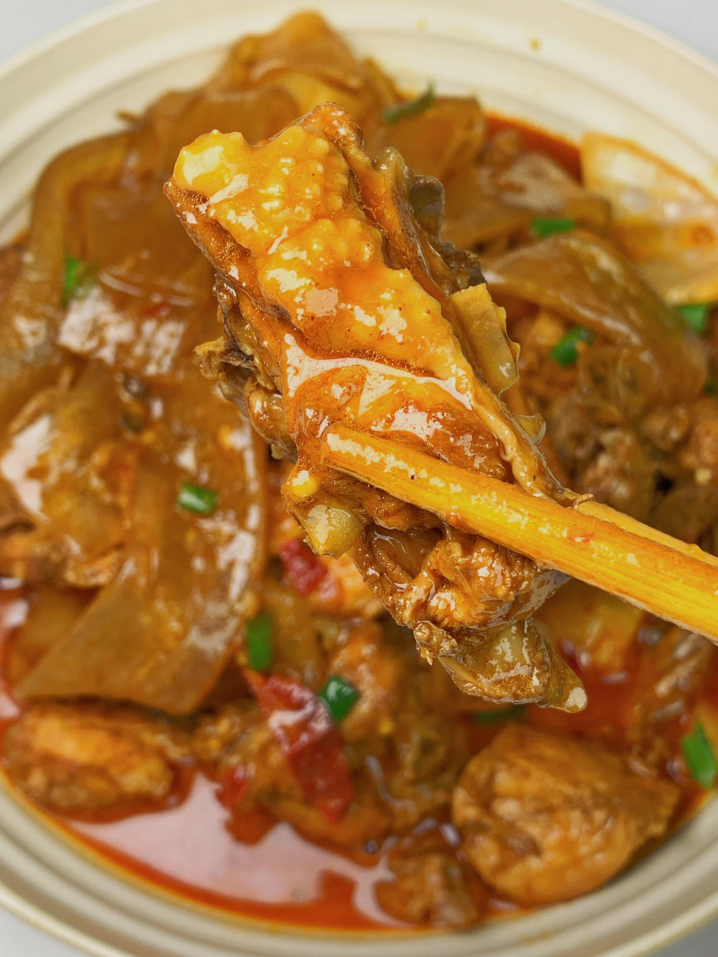 谁懂啊!这锅宽粉鸡肉煲,才是真正的下饭王者!麻辣鲜香的浓稠汤汁,裹着糯叽叽的宽粉,每一根都吸饱了汤汁,鸡肉炖得软嫩脱骨,轻轻一抿就化,好吃到连碗底的酱汁都想舔干净~