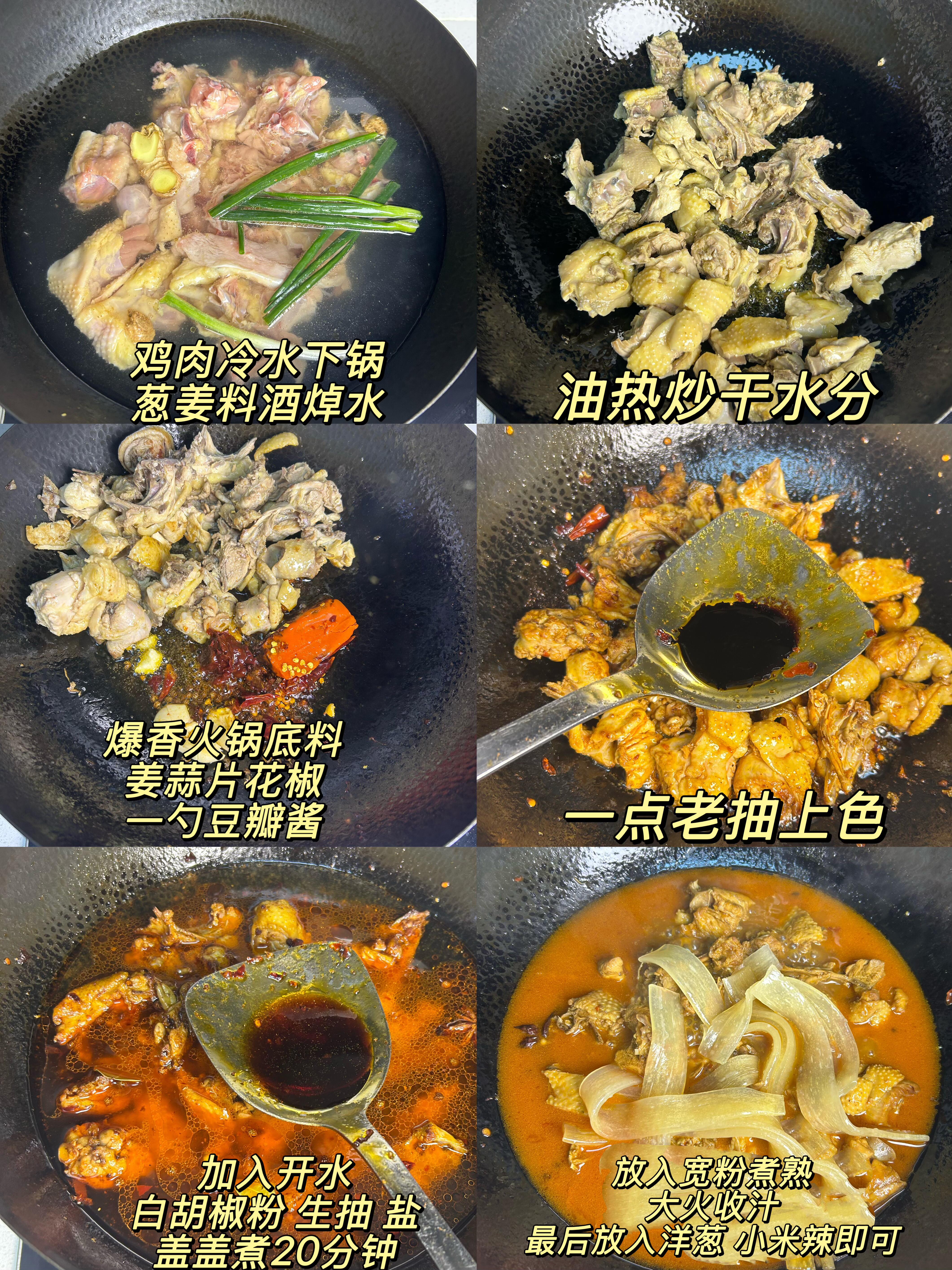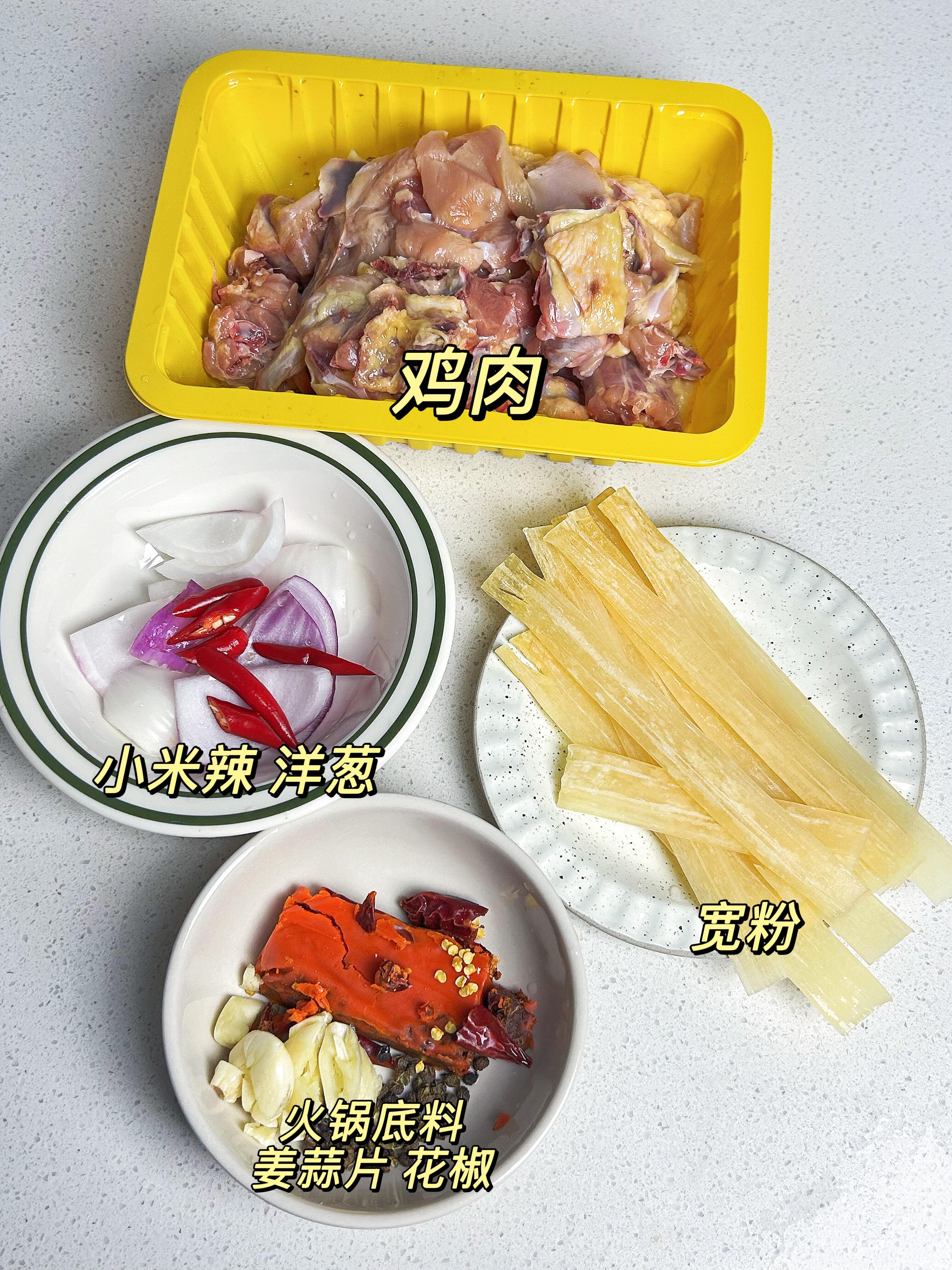 ✅准备食材:鸡肉(半只斩块)、宽粉(提前泡软)、洋葱半个、小米辣、姜蒜片、花椒、火锅底料、豆瓣酱、生抽、老抽、料酒、盐、白胡椒粉